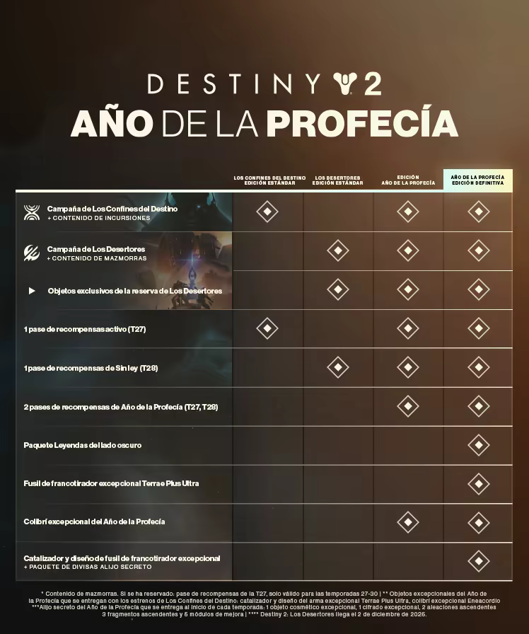 Vive un año entero de exploración y aventuras con la Edición Año de la Profecía de Destiny 2, que incluye dos expansiones (Destiny 2: Los Confines del Destino y Destiny 2: Los Desertores), así como el principio de una nueva saga en Destiny.