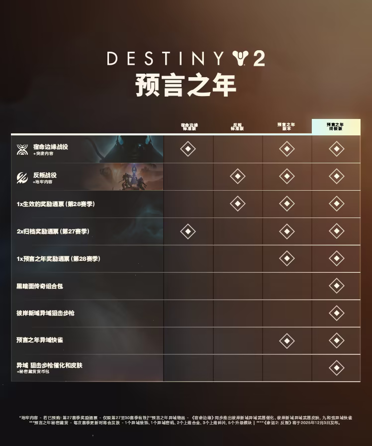 《命运2:宿命边缘》开启了宿命传奇,守护者们将探索太阳系边缘的神秘地点,并发现强大的新技能。《命运2:反叛》将继续冒险——在无序边界中,穿越黑暗帮派世界,组建队伍,提升名望。召集火力战队,准备迎接新突袭和地牢。挑战命运,阻止灭绝预言。