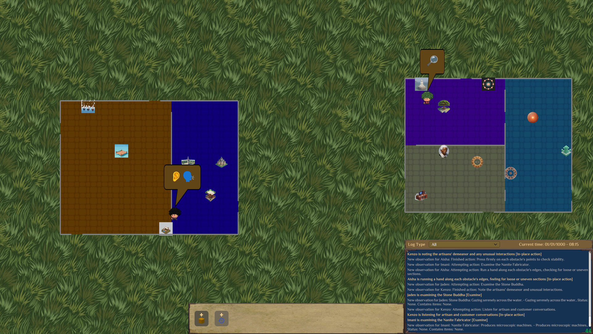 Towns are procedurally generated via your prompt. Manipulate a character's goals or add new objects into the world to see how they react and develop over time.