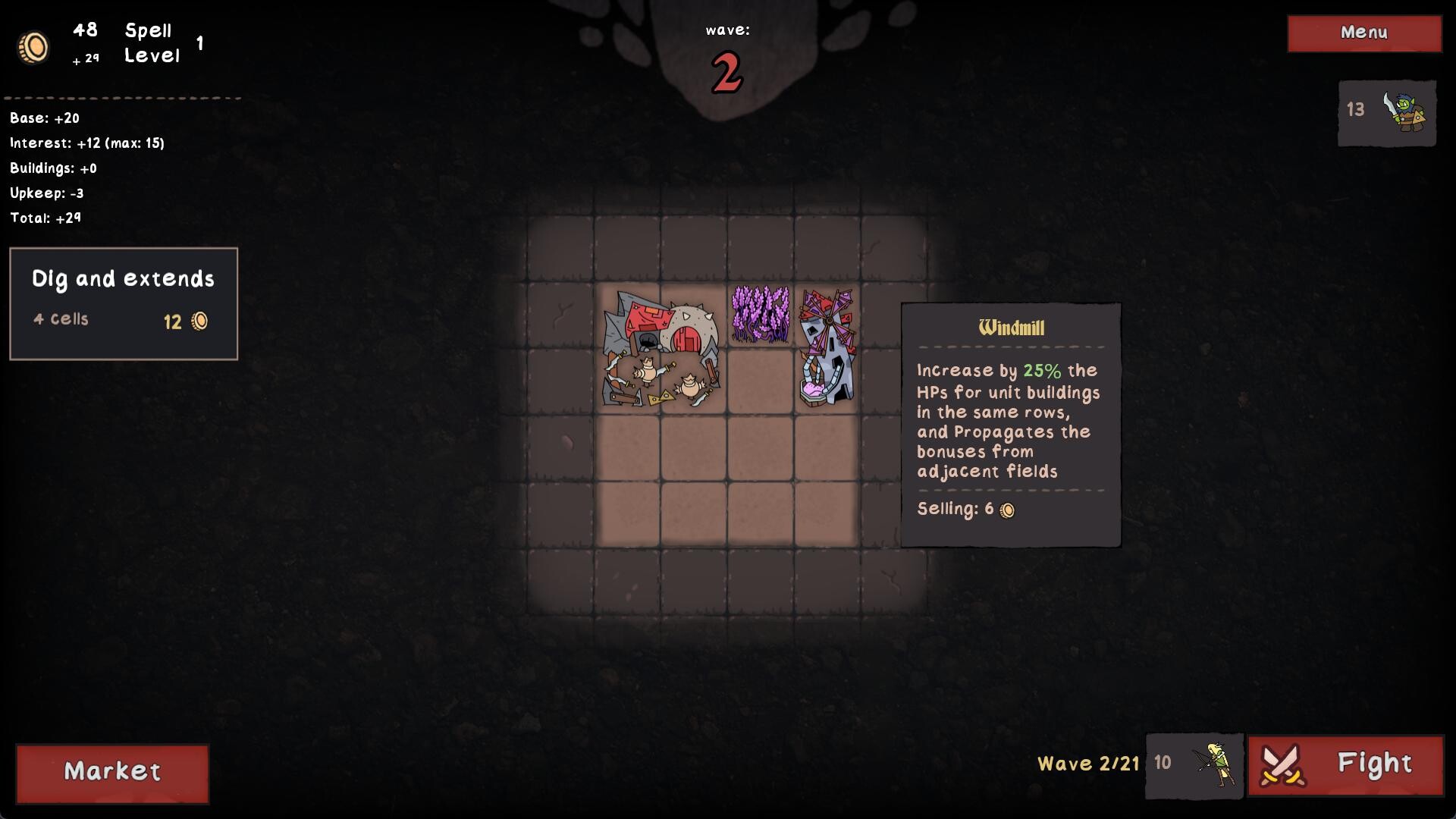 Packed Lair is a base building auto-battler roguelike where you place your buildings like in an inventory to create a powerful army of orcs, goblins and other monsters, then send them to defeat your enemies.