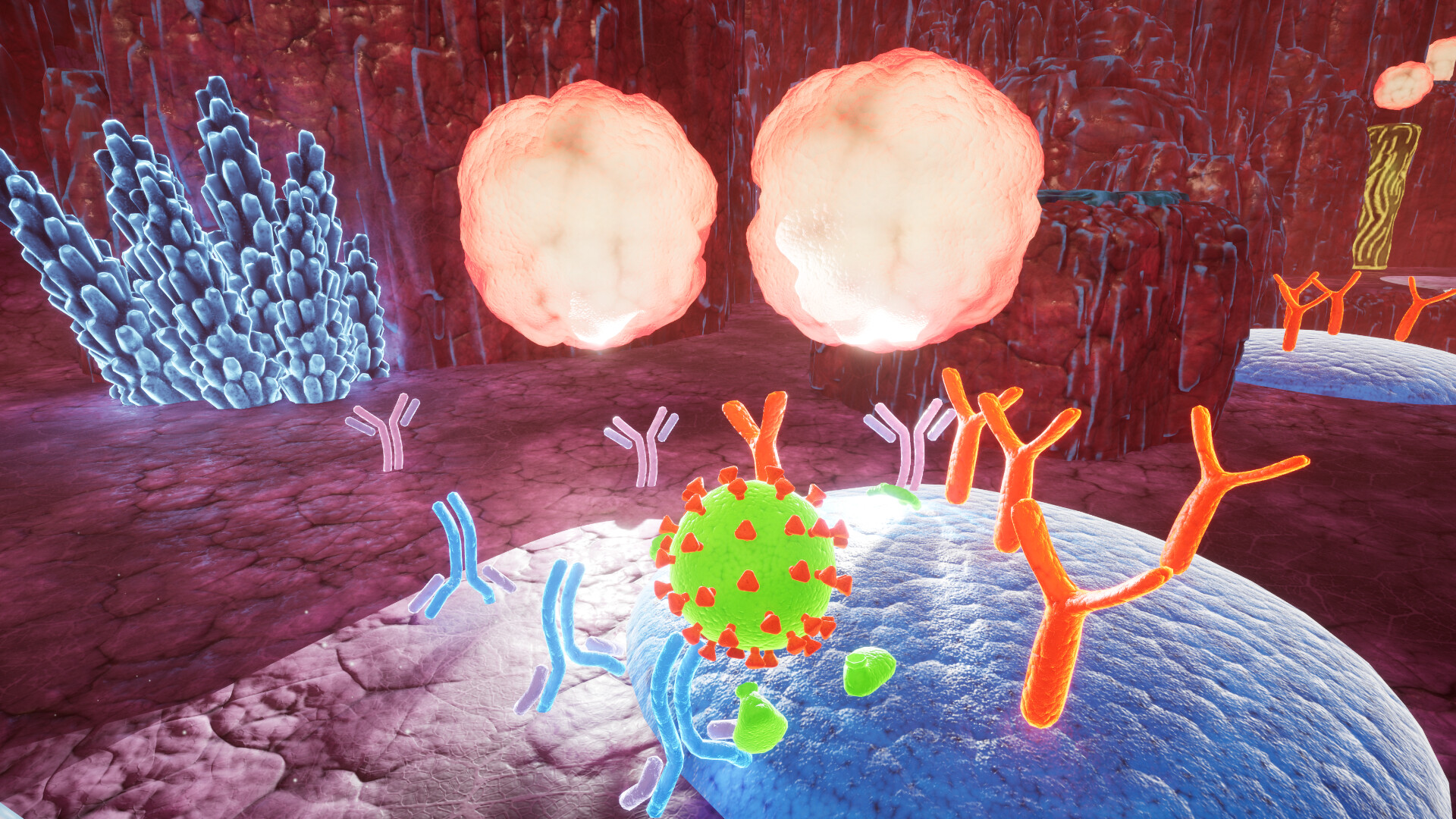 A third person, action-adventure game with a medieval and biology style. Explore inside the human body as a COVID-virus fighting your way past enemy white blood cells and immune proteins. Find and infect cells to score points.