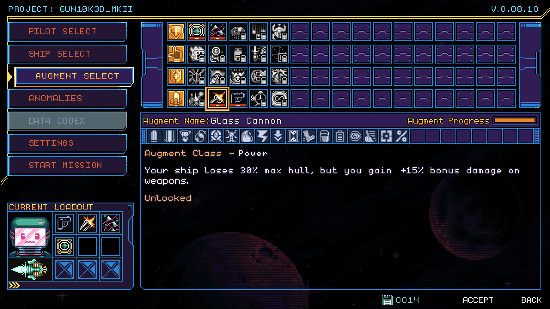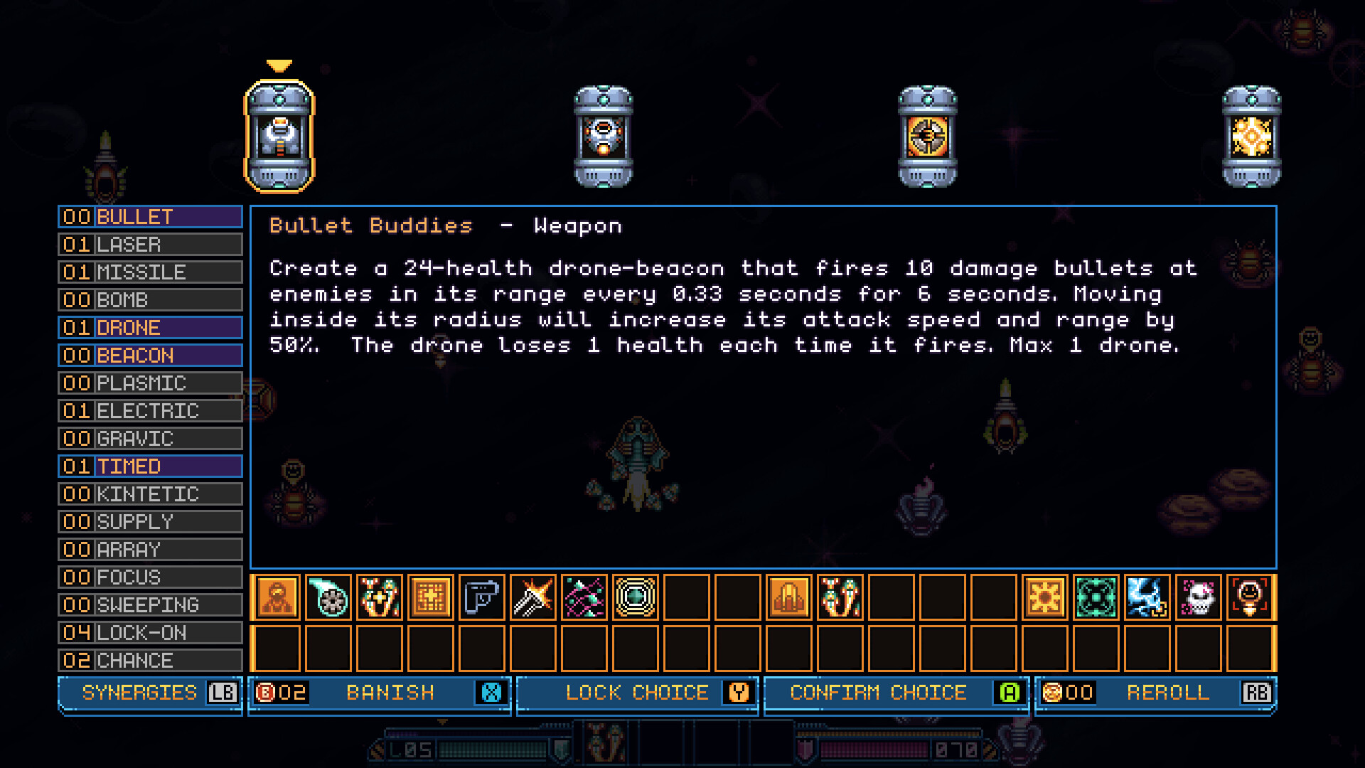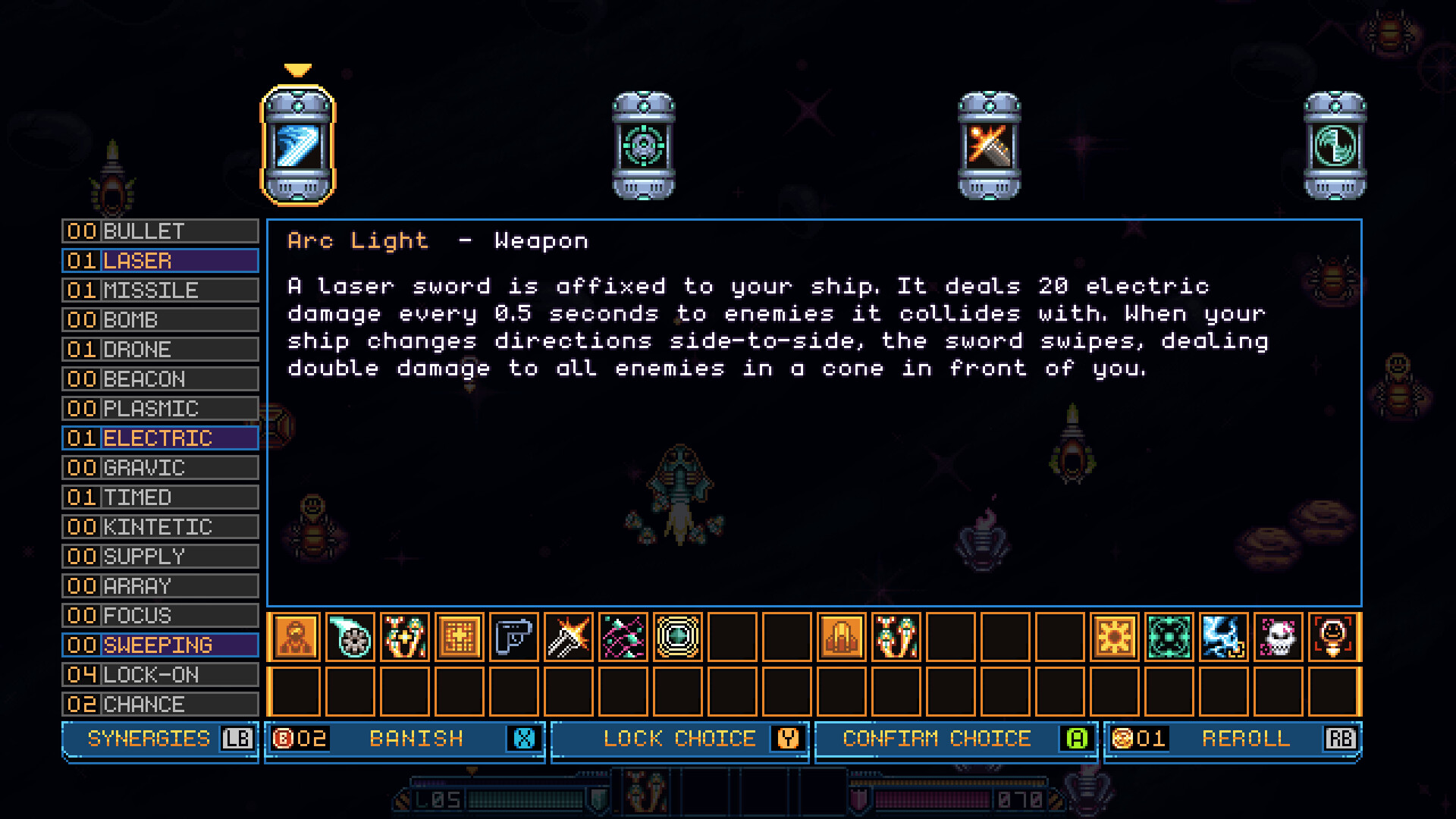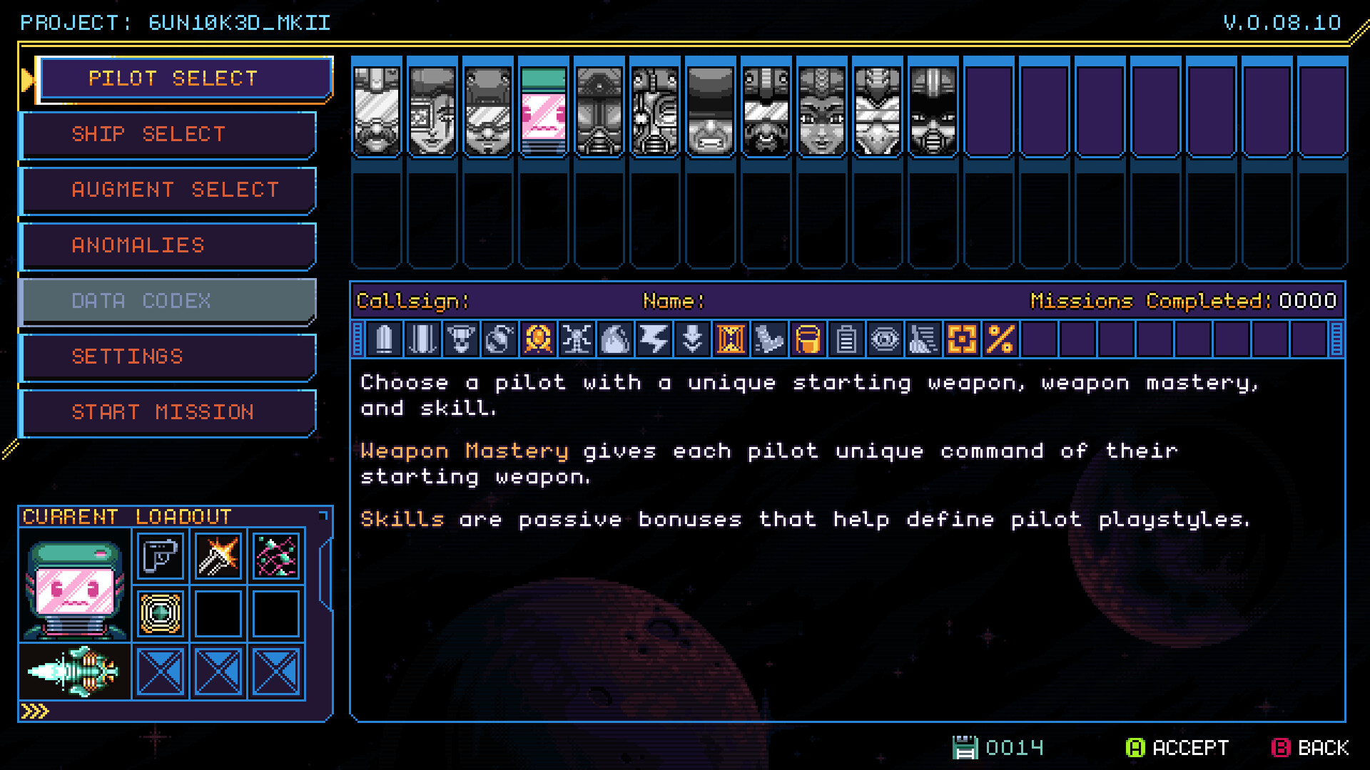 • Weapon Mastery: Each pilot has masterful command over their starting weapon, giving them a unique weapon variant no other pilot has access to.