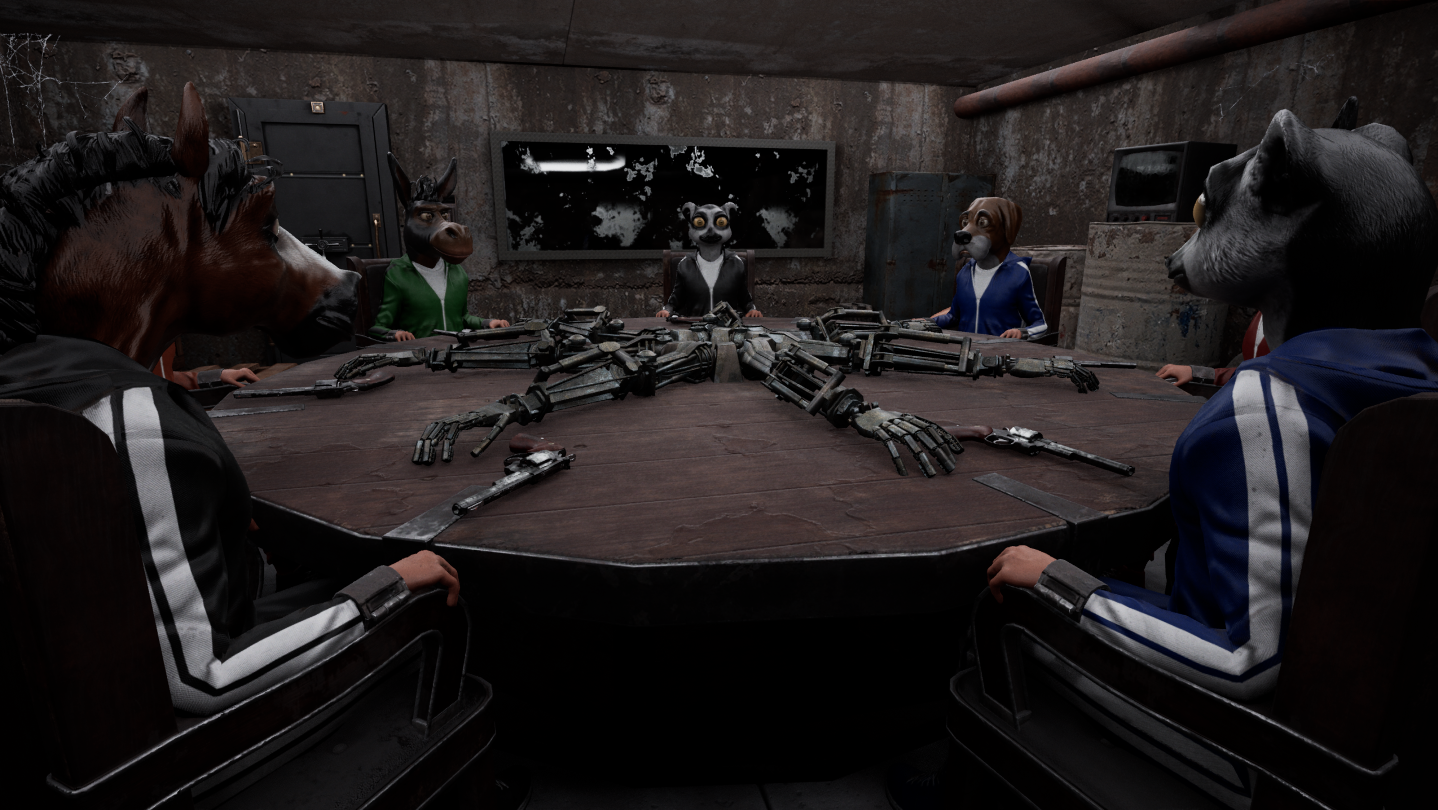 UNKNOWN FACES is a multiplayer social deduction game set in a dark, eerie interrogation room. Players are randomly assigned roles (for example, mafia or citizens) and may be executed if targeted by the mafia or voted out. Executions are stylized and bloodless, with ragdoll physics and robotic arms firing revolvers; no gore or mutilation is shown. The environment is suspenseful and tense, designed to create psychological fear. Players can communicate via text and voice chat, which may include swearing. There is no nudity, sexual content, depiction of suicide, illegal drug use, or discriminatory targeting of real-world groups.