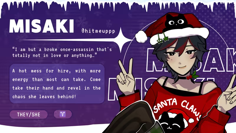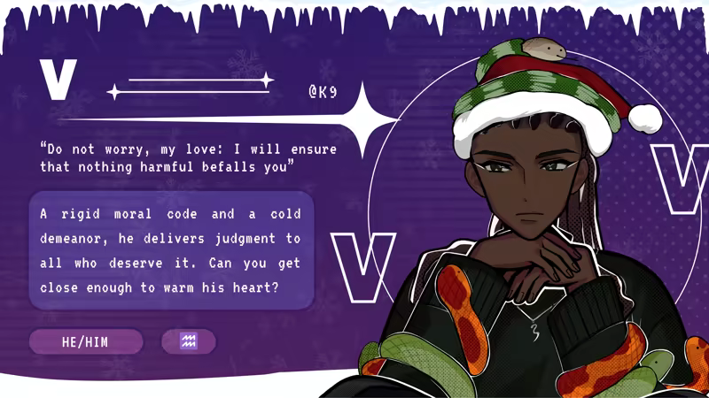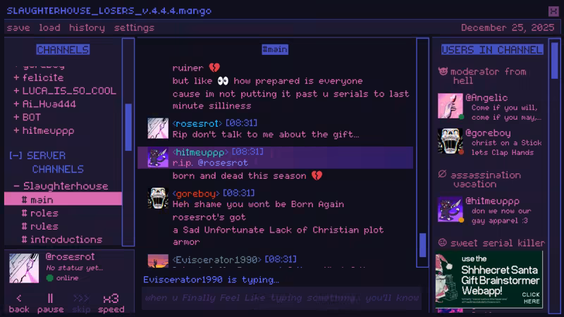 In this festive addition to the dark satire romance chatsim Killer Chat! series, journey through the server’s past, present & future to learn more about our serials and find the true meaning of Christmas. What's the worst that could happen?