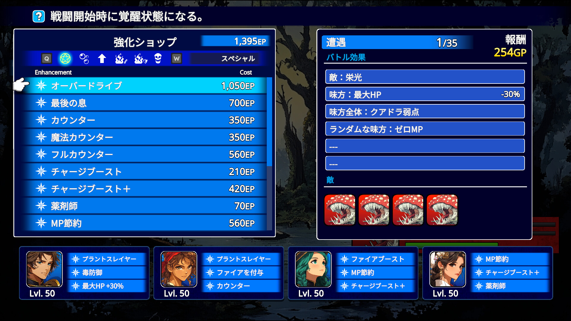 強力な強化アイテムで戦略をカスタマイズ! 各バトル後に強化ポイント(EP)を獲得し、一時的なバフを得ることで、バトルコンディションに対抗したりクラスの弱点をカバーすることができる。最大HPを上げ、攻撃を強化し、どんな困難にも打ち勝てるようにパーティを調整しよう!