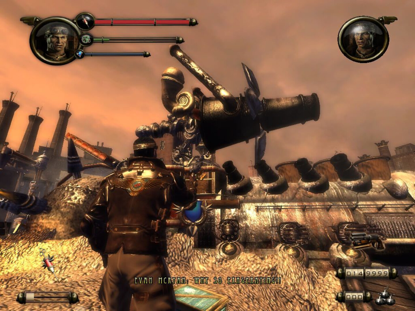 It is the world of Steam Slug, the world where in the end of XIX century history followed an alternative path and machines rise against the mankind. Smoking steam monsters with bleeding human brains encased in brass roam devastated cities and skies are blackened with mechanical creatures. There is no place to go, the machines are everywhere and the only way of survival for you and for the mankind is to fight evil steam engines and to find the ultimate evil behind their creation – mysterious Mephistopheles. In the world of Steam Slug you have almost no chance of survival but death is not an option…