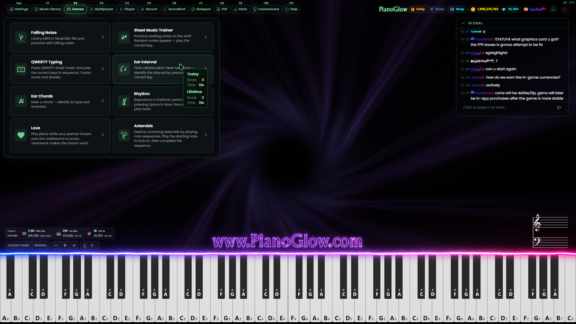 • Typing game modes, where falling notes (and sheet music based notation) are also shown with QWERTY notes.