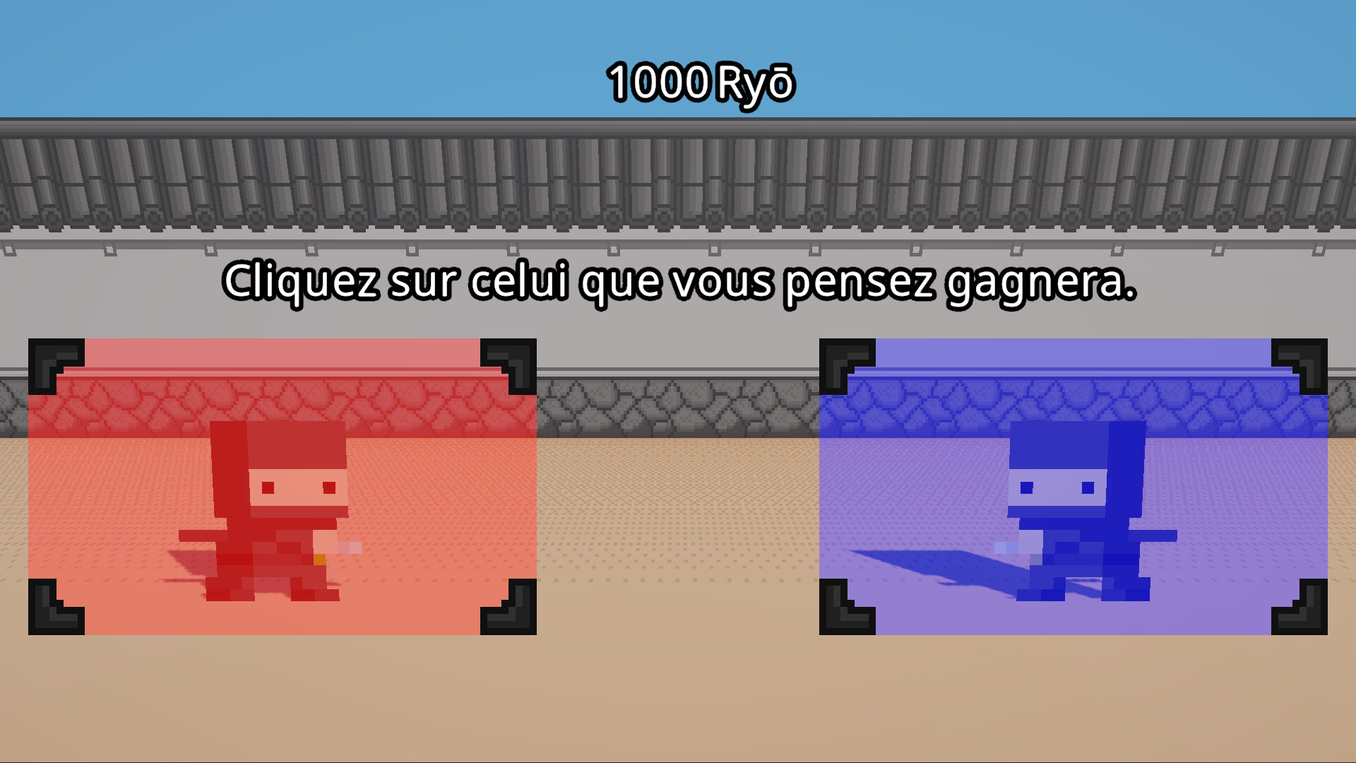 Pariez sur quel ninja remportera le duel ! Si vous gagnez, vous doublez votre mise !Si vous perdez, tout est perdu ! Commencez avec 100 ryō et visez le maximum de 99 999 ryō ! Un jeu purement basé sur la chance—aucune stratégie requise !