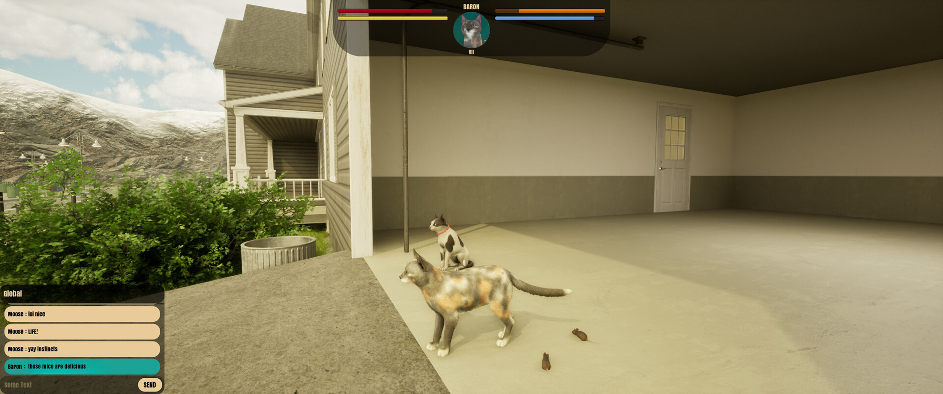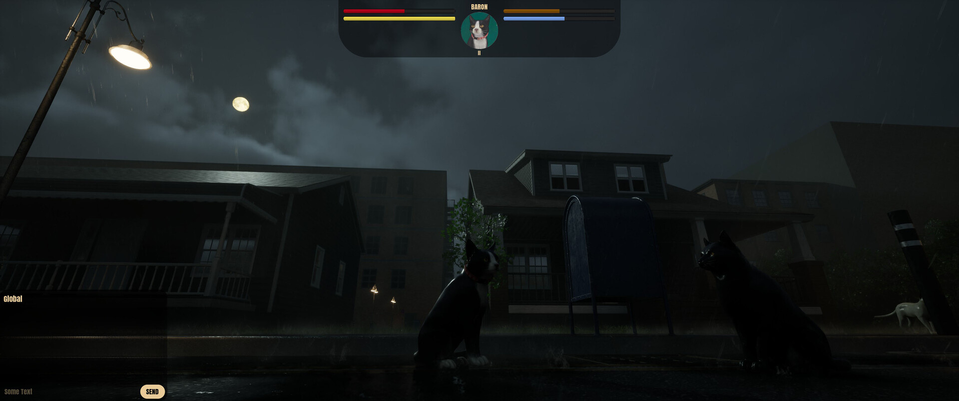 “Currently, the player is able to choose between a small amount of cats. They can wander the city as a cat, find food and water, and connect with other cat friends. There is basic communication by way of gestures, such as nuzzling, meowing, and hissing, as well as a simple chat window. The player can become a pet, and there is an instinct system to drive the player forward.”