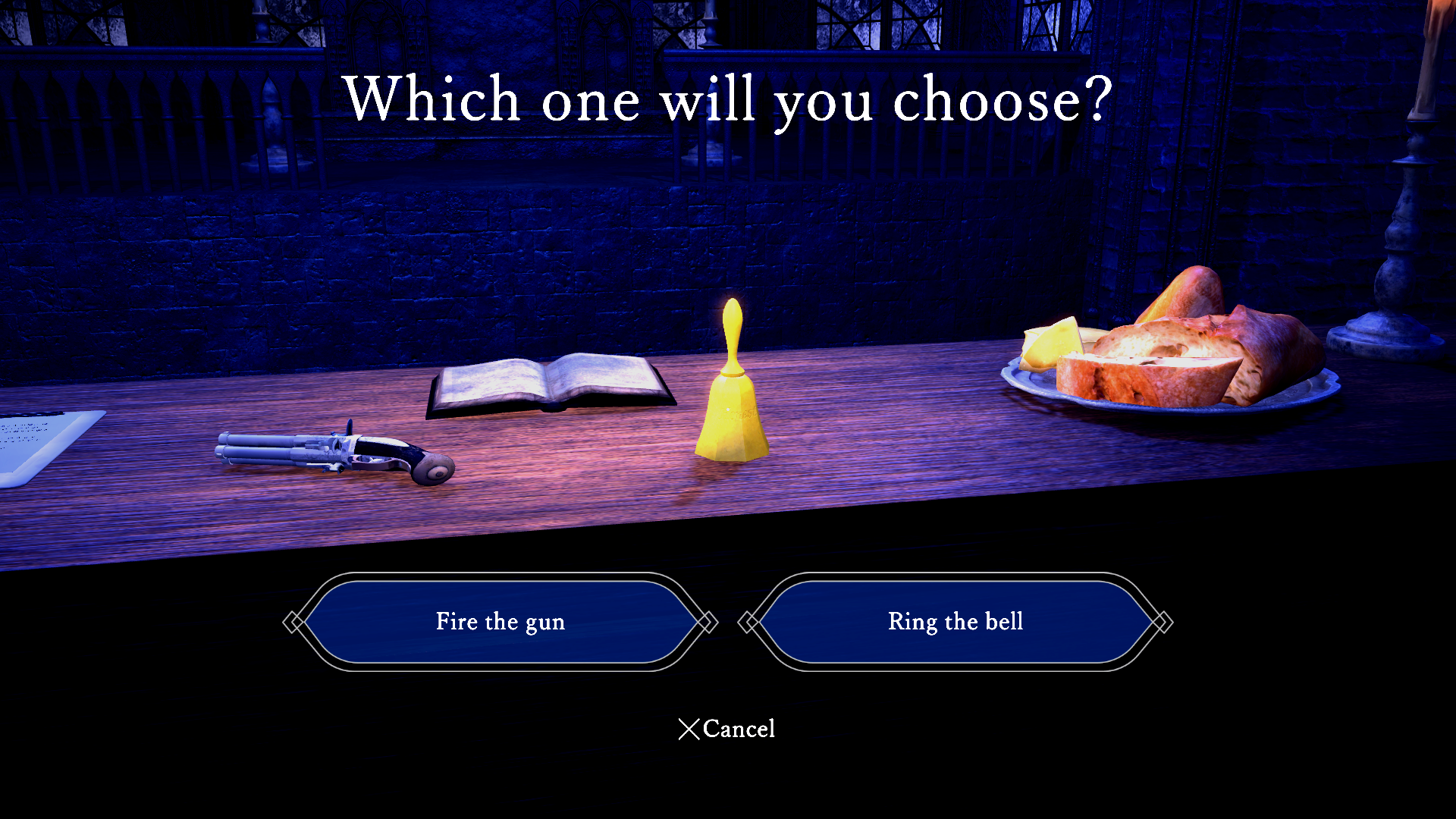 中世ヨーロッパの小さな古城で、異変が起きた時は「銃」を、何も起きていない時は「ベル」を選択する。