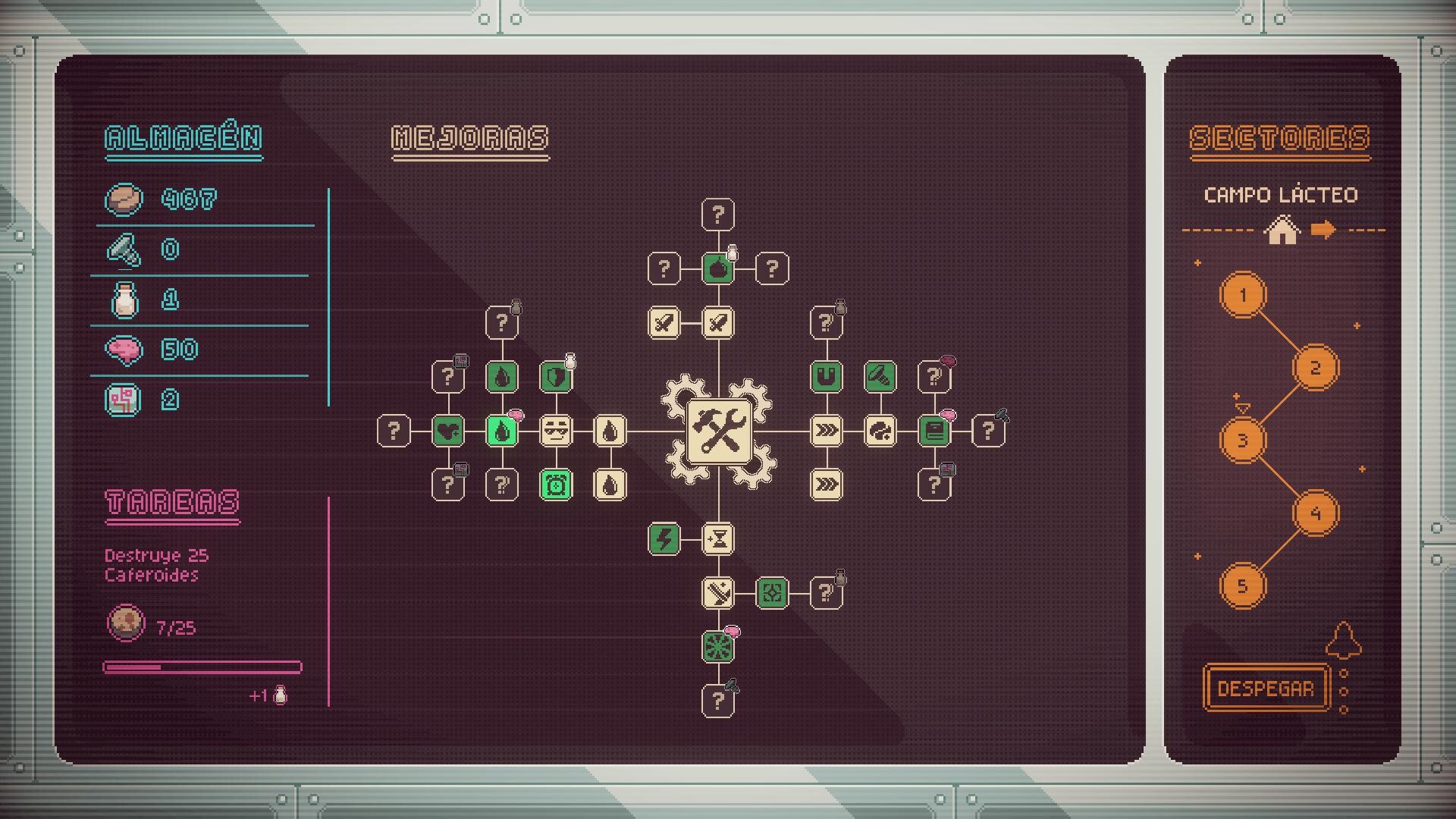 Astro Prospector es un bullet hell incremental en el que minas caferoides y combates contra la malvada SpaceCorp. Recoge recursos, mejora tu nave y hazte imparable. ¡Devuelve el AstroCafé a la humanidad!