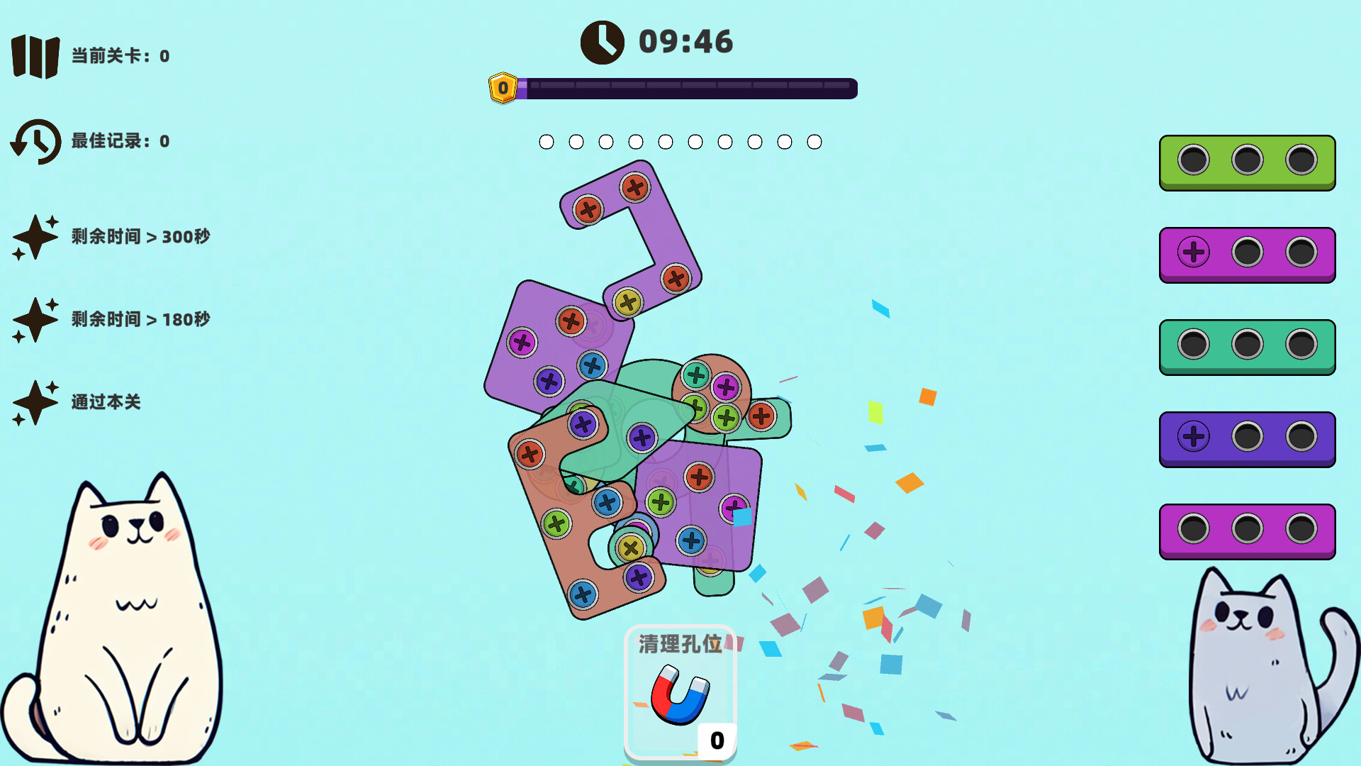 这是一款轻松休闲的解谜游戏,只需将不同颜色的螺丝从板上取下,放入对应颜色的盒中即可。