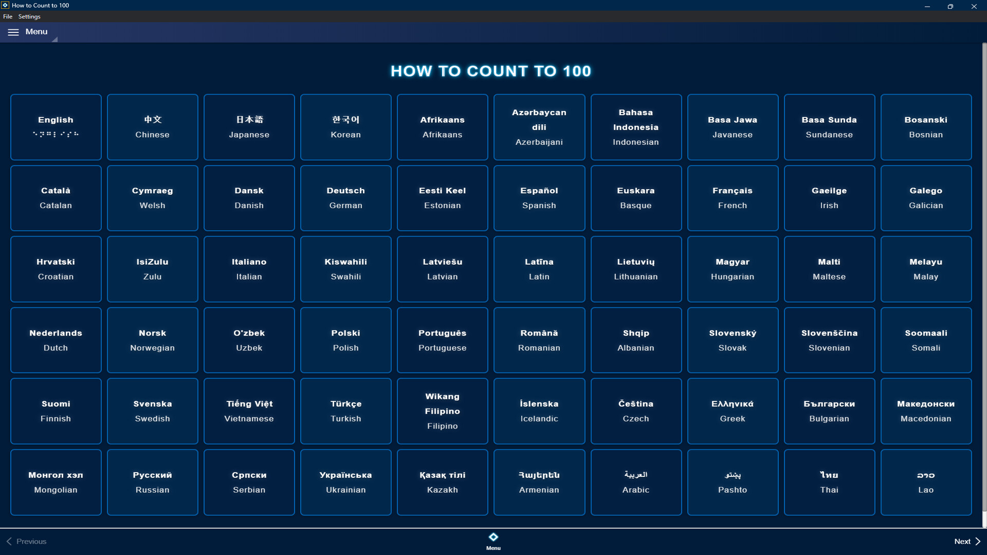 - Includes: Afrikaans, Albanian, Arabic, Armenian, Azerbaijani, Basque, Bosnian, Bulgarian, Catalan, Chinese, Croatian, Czech, Danish, Dutch, English, Estonian, Filipino, Finnish, French, Galician, German, Greek, Hungarian, Icelandic, Indonesian, Irish, Italian, Japanese, Javanese, Kazakh, Korean, Lao, Latin, Latvian, Lithuanian, Macedonian, Malay, Maltese, Mongolian, Norwegian, Pashto, Polish, Portuguese, Romanian, Russian, Serbian, Slovak, Slovenian, Somali, Spanish, Sundanese, Swahili, Swedish, Thai, Turkish, Ukrainian, Uzbek, Vietnamese, Welsh, Zulu