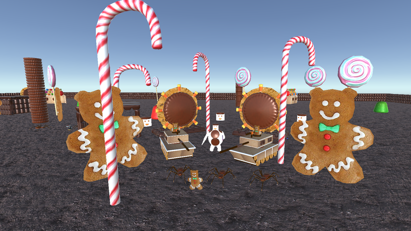 -Ridiculous enemies: Fight Gingerbread men, chocolate spiders, marshmallows and tanks made of graham crackers.