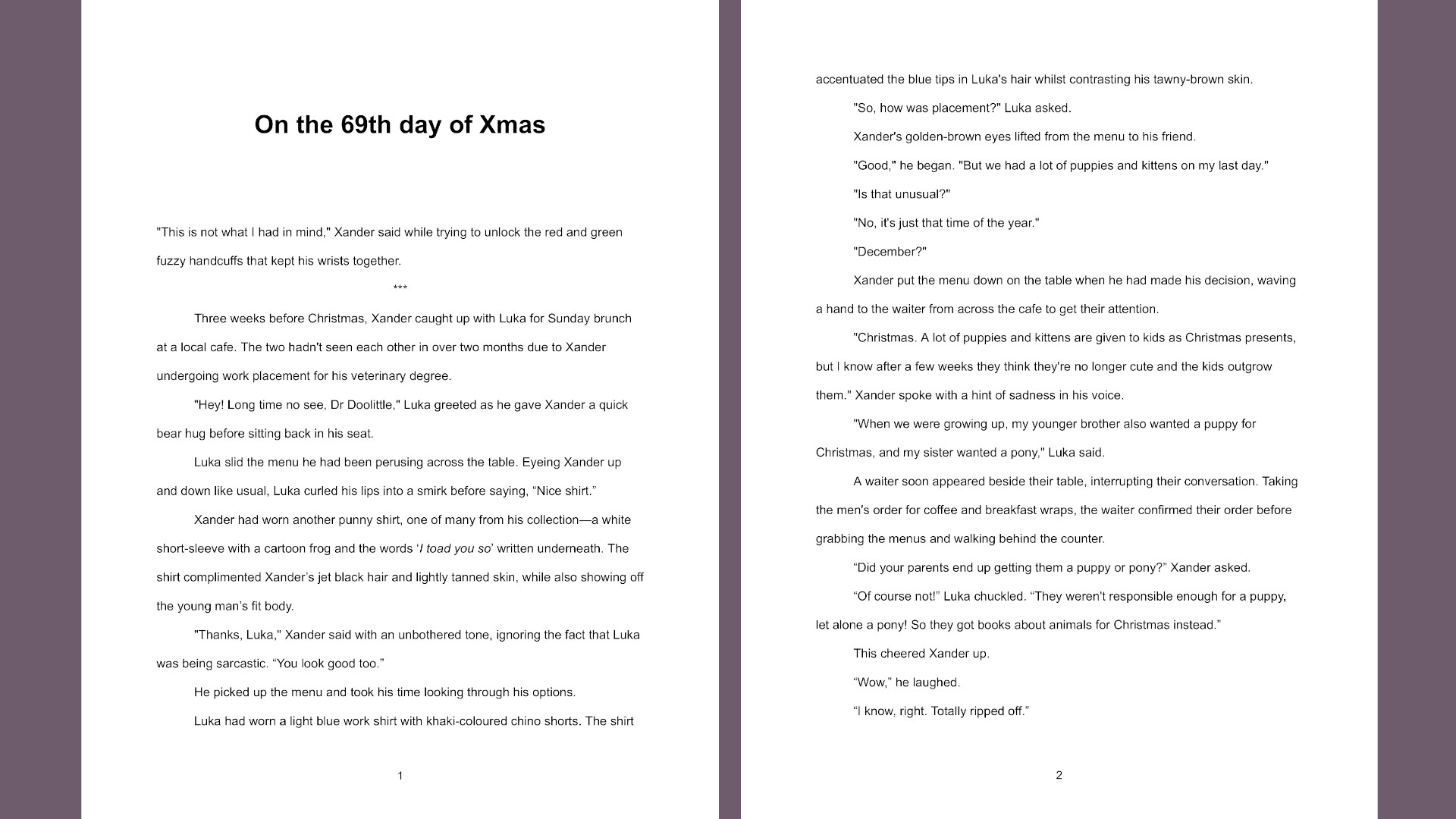 On the 69th day of Xmas is a short and sweet, erotic ebook that continues from the Fuck Buddies and/or Friends with Benefits endings of the visual novel game, Wrong Number. It follows Luka and Xander's first Christmas together after the events of the game.