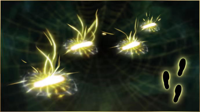 Markiere deinen Gang mit Fäden himmlischer Seide. Die Fußabdrücke der Weberin hinterlassen leuchtende, sternenförmige Muster, die mit schimmernden Energielinien verbunden sind. Fast scheint es so als wäre die Weberin selbst hier, um deine Schritte durch die Zeit zu lenken.