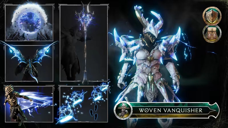 "Tritt ein in das Netz des Schicksals mit den Fäden der Weberin selbst. Das Supporter-Paket „Gewebte Legende“ ist der ultimative Ausdruck der Hingabe gegenüber an die Gewebten und bietet unvergleichliche Verbesserungen, durchtränkt mit den Geheimnissen der dunklen und rätselhaften Macht der Weberin. Von dem ätherischen Mantel des Gewebten zum bezaubernden Fadenläufer-Haustier verwandelt dich dieses Paket in eine lebende Legende von Eterra.