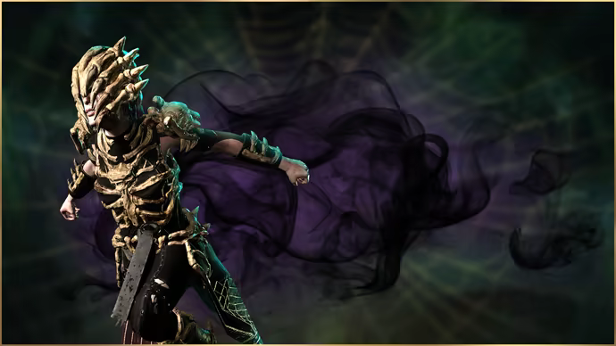 披上编织者之拥——编织门徒之帷幕。这套精巧打造的护甲散发着神秘的能量,其黑暗的色调,与发光的蓝绿色装饰,还有蜘蛛图案交织在一起。凭借其超凡的存在感,这套护甲将你转变为编织者意志的先驱者。
