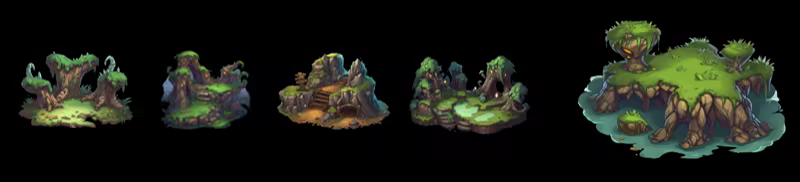 Kylän lähellä on 5 aluetta, ja saat palkinnon joka kerta, kun tyhjennät alueen: Metsä, Rannikko, Hauta, Jäätikkö, Helvetti.