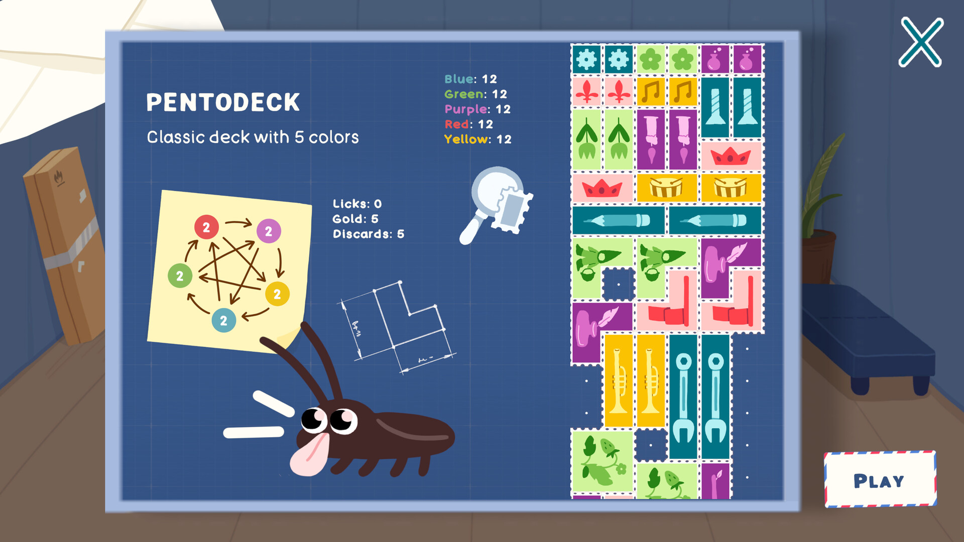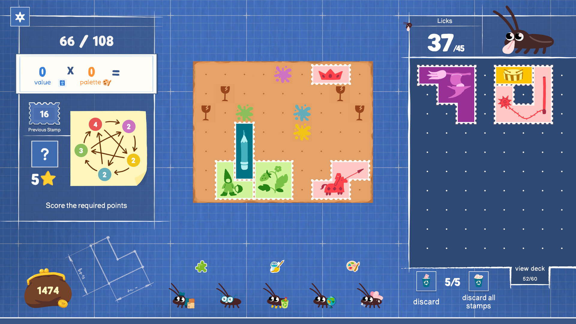 Roach Post is a roguelike puzzle game where you use polyomino-shaped stamps to teleport packages, earning points through clever combinations of shapes, colors, and hardworking roach assistants.