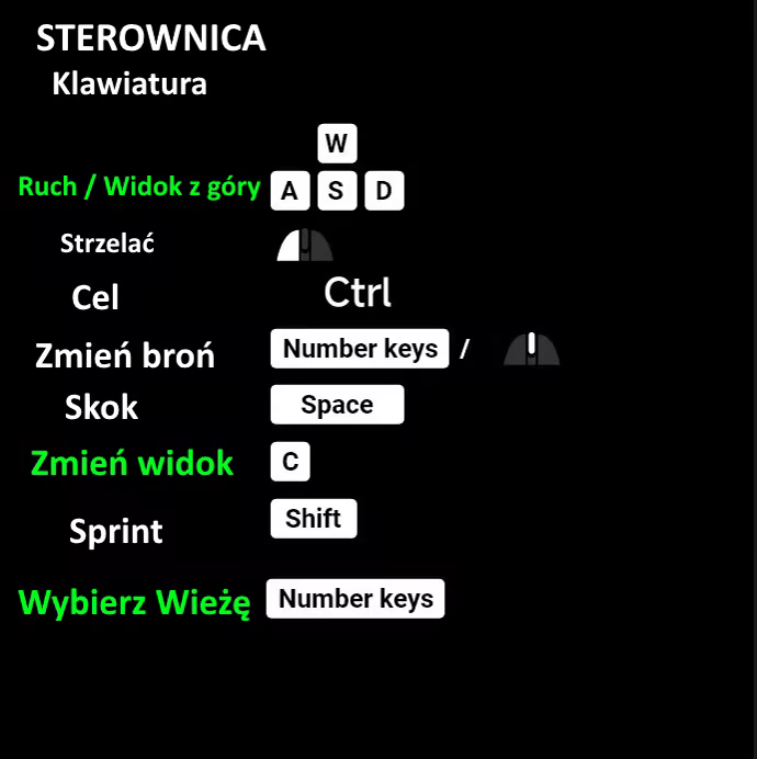 Użyj klawiszy numerycznych 1, 2, 3, aby szybko wybrać wieże obronne, oraz klawiszy W, A, S, D, aby się poruszać. Ruch jest możliwy zarówno w widoku postaci, jak i z góry.