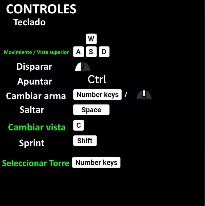 Usa las teclas 1, 2, 3 del teclado numérico para seleccionar rápidamente las torres defensivas y W, A, S, D para moverte. Tanto la perspectiva del personaje como la aérea permiten movimiento.