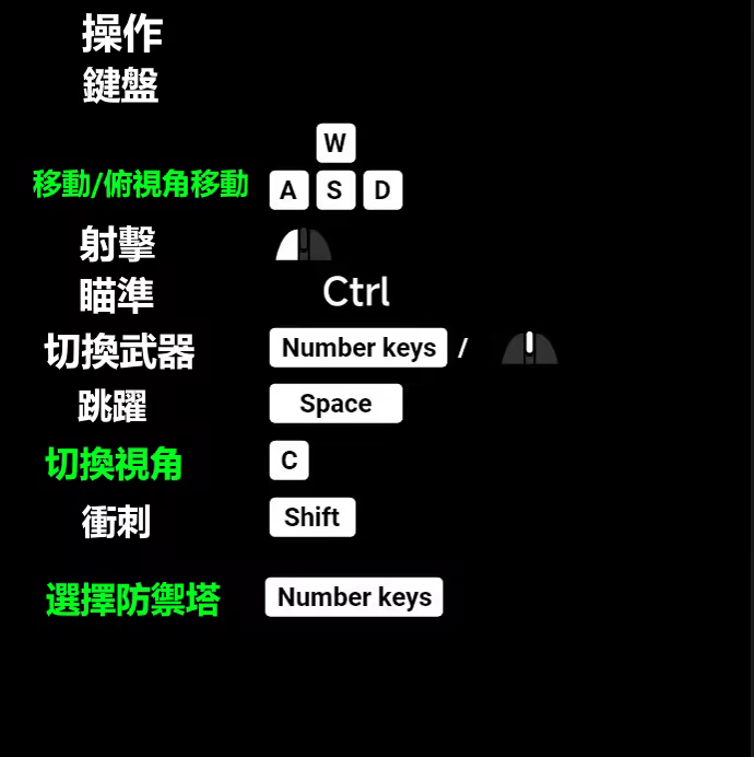 小鍵盤1、2、3可以快速選擇防禦塔,W A S D可以進行移動,人物視角與俯視角,兩個視角都可以移動。