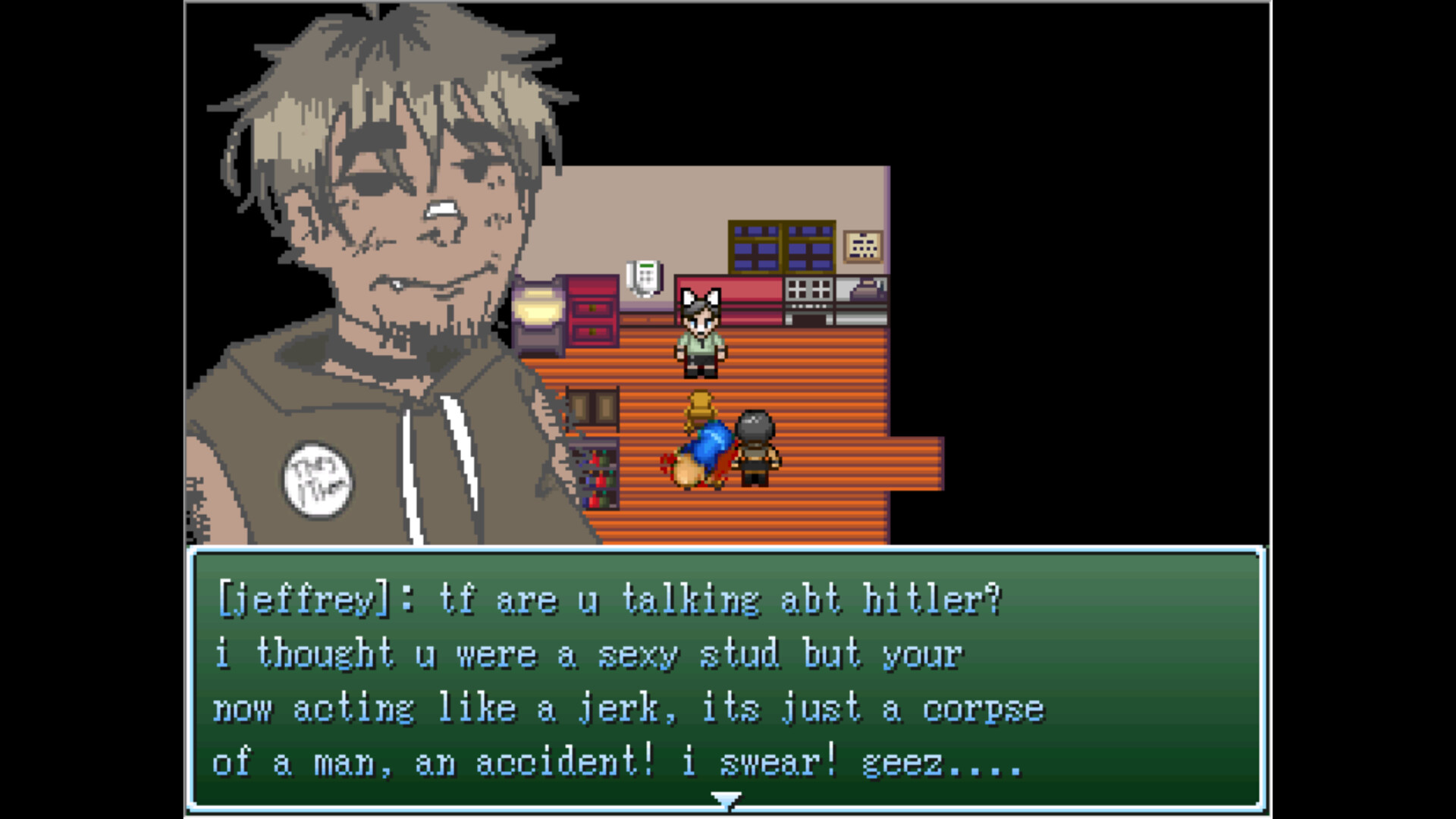A classic story-driven adventure game—no battles, no puzzles, just an immersive narrative. Watch as Jeffrey, the protagonist, goes on a date with a femboy he met on an app called “Hitler.” At the same time, Jeffrey must keep Hitler from discovering the corpse in his basement while trying to get into his pants. Will he succeed?