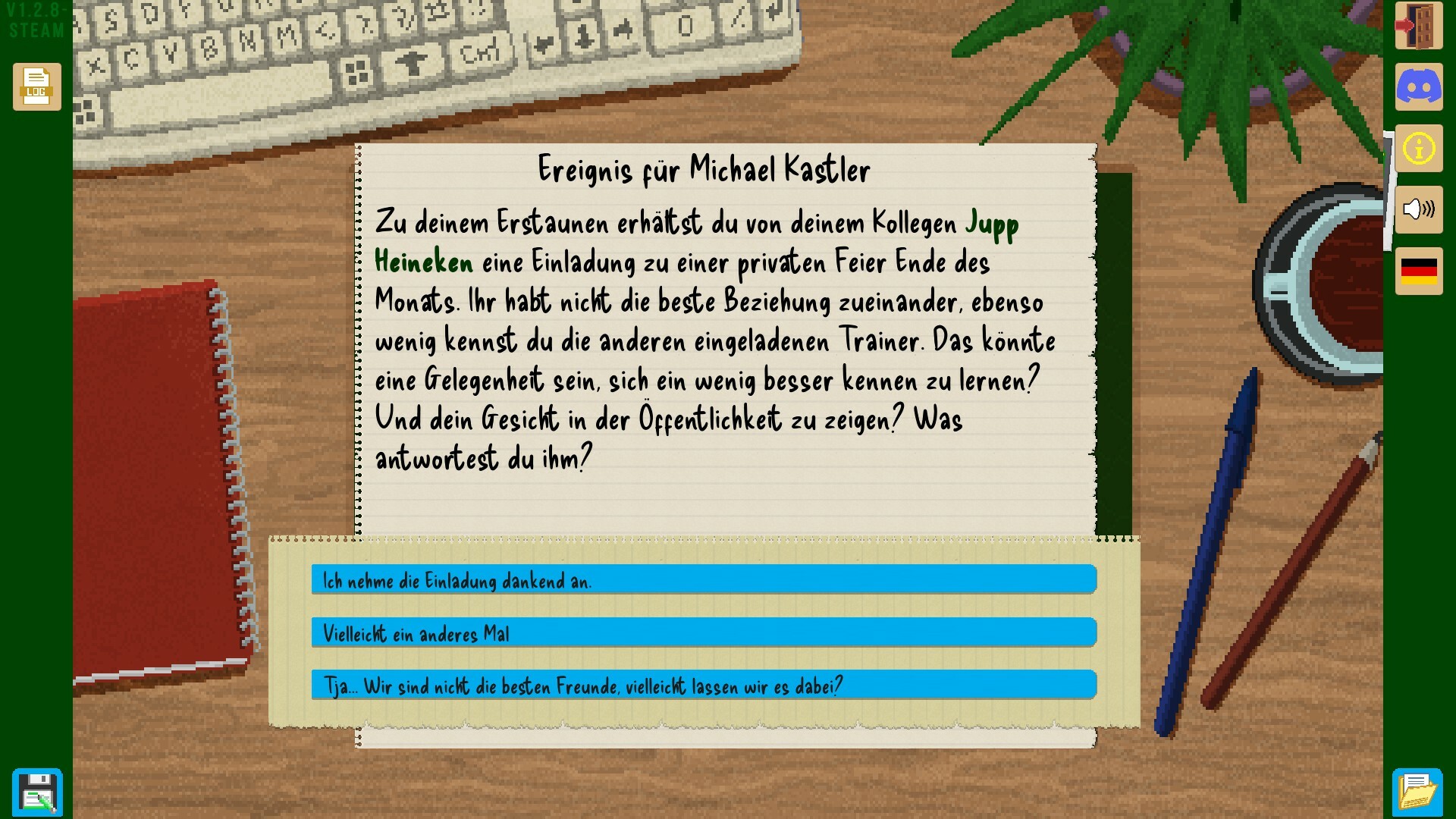 • kleinteiliges Tutorial; das Herausknobeln der verschiedenen Systeme ist Teil der Reise, schließlich bist du ein unerfahrener Coach, der "das Spiel" noch lernen muss. Außerdem hatten die wenigsten Spieler der 90er Handbücher... ok, sie hatten welche, aber du weißt, was ich meine ;)