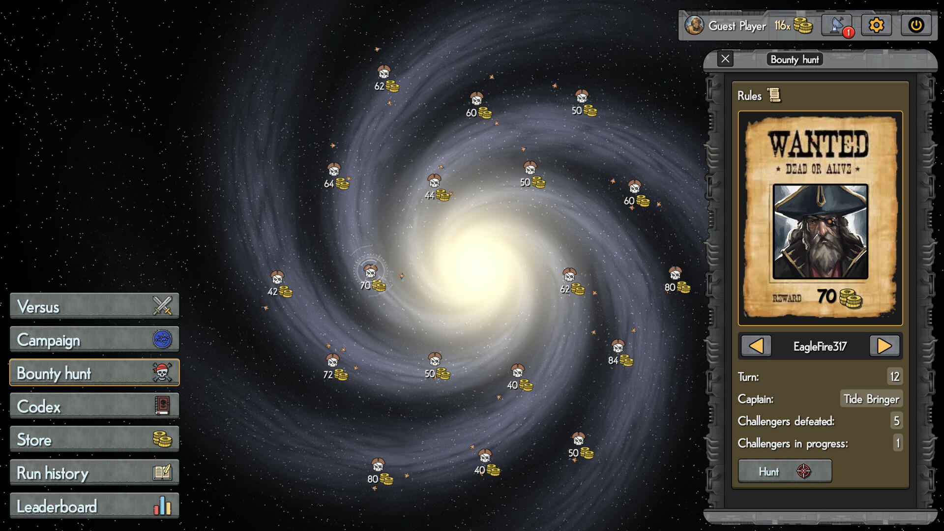 • Bounty Mode: Pirate lords and undefeated builds sit on a sector map with prices on their heads. Crack one and you take their square—earning steady gold from anyone bold (or dumb) enough to challenge your throne.