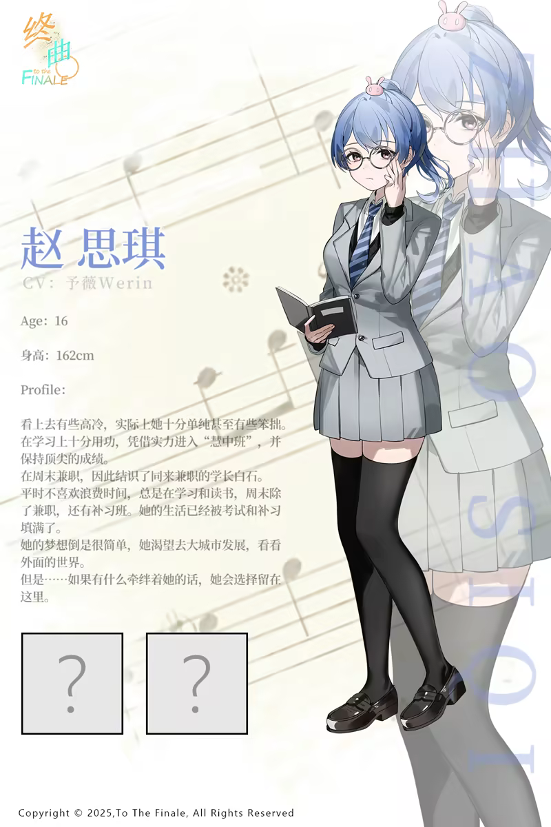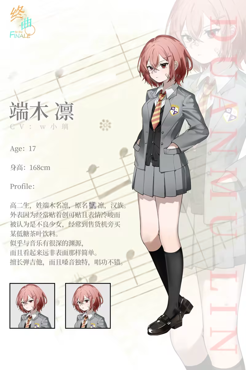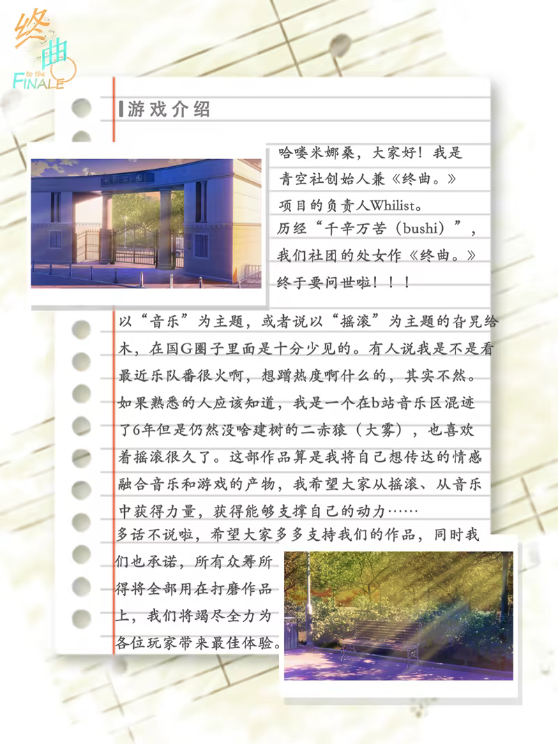 《终曲。》是由青空社AozoraSoftware开发的视觉小说游戏,游戏通过点击鼠标来进行故事推动,以便更加沉浸的体验故事。故事以音乐为主题,讲述了一个被摇滚所救赎的故事。