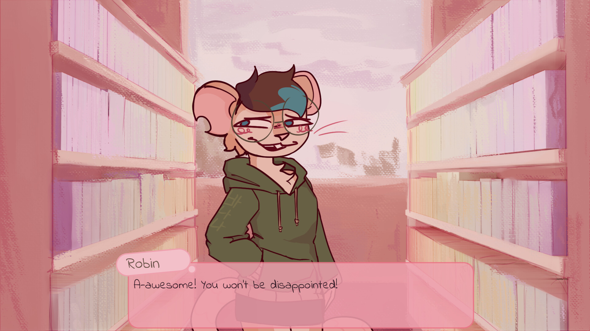 Robin is a cute non-binary mouse who loves to geek out about manga and video games. While they are very shy around new people, they love to talk about their interests.