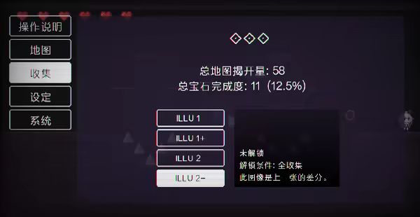 游戏有两张插画,每张插画有一个差分,一共四个项目,可以通过完成下面这些目标来解锁。