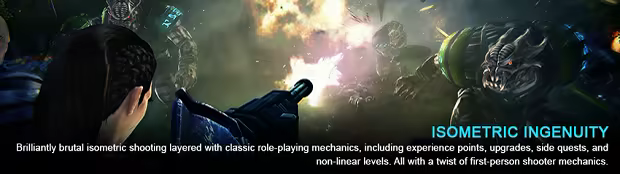 Brilliantly brutal isometric shooting layered with some classic role-playing mechanics, including experience points, upgrades, side quests, and non-linear levels. All with a twist of first-person shooter mechanics.
