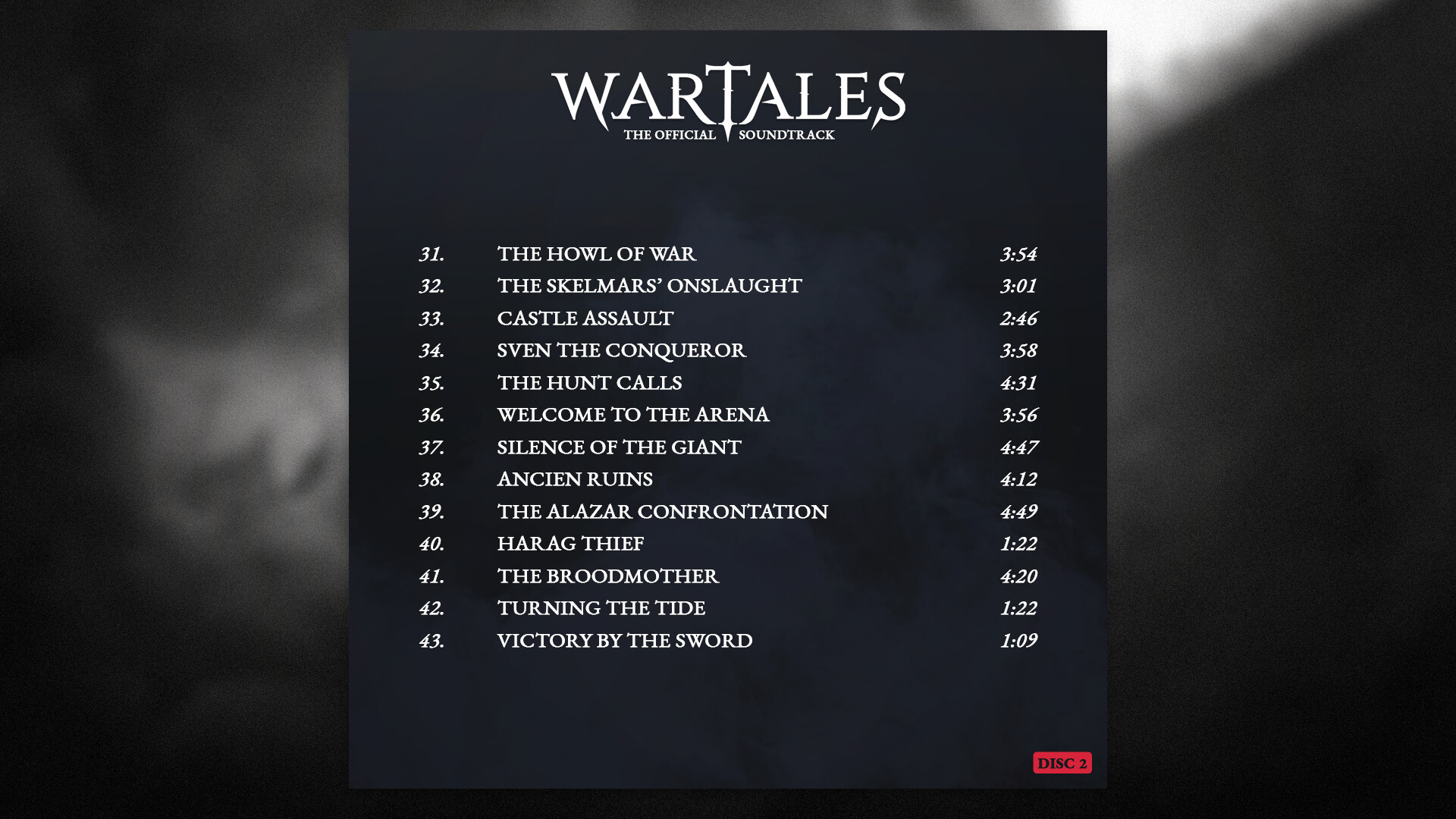 For over 1 hour and 58 minutes, let these powerful compositions accompany you as you fight, explore, and carve your legend into the unforgiving lands of Wartales!