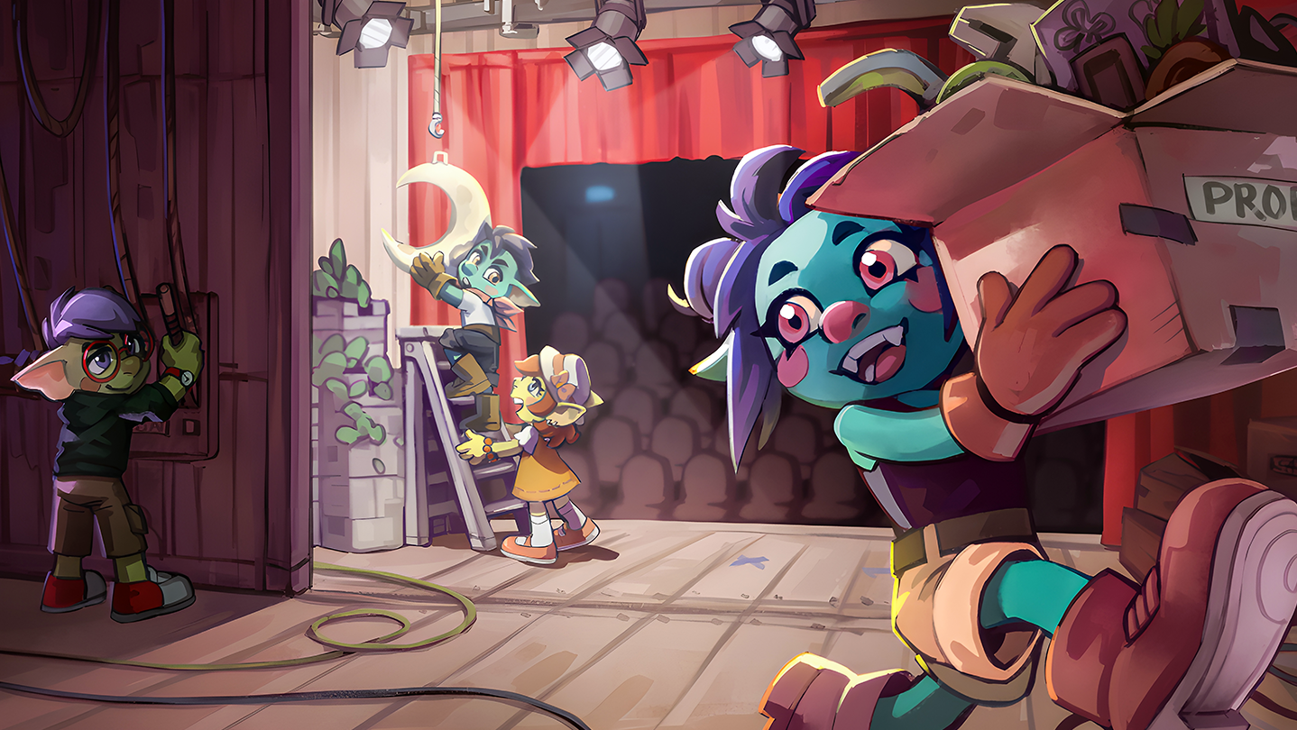 Staged is a co-op first-person physics party game for 1–4 players. Play mischievous goblins, rebuild stage sets from reference photos, haul oversized props through tight backstage spaces, and get every placement right before the curtain rises.