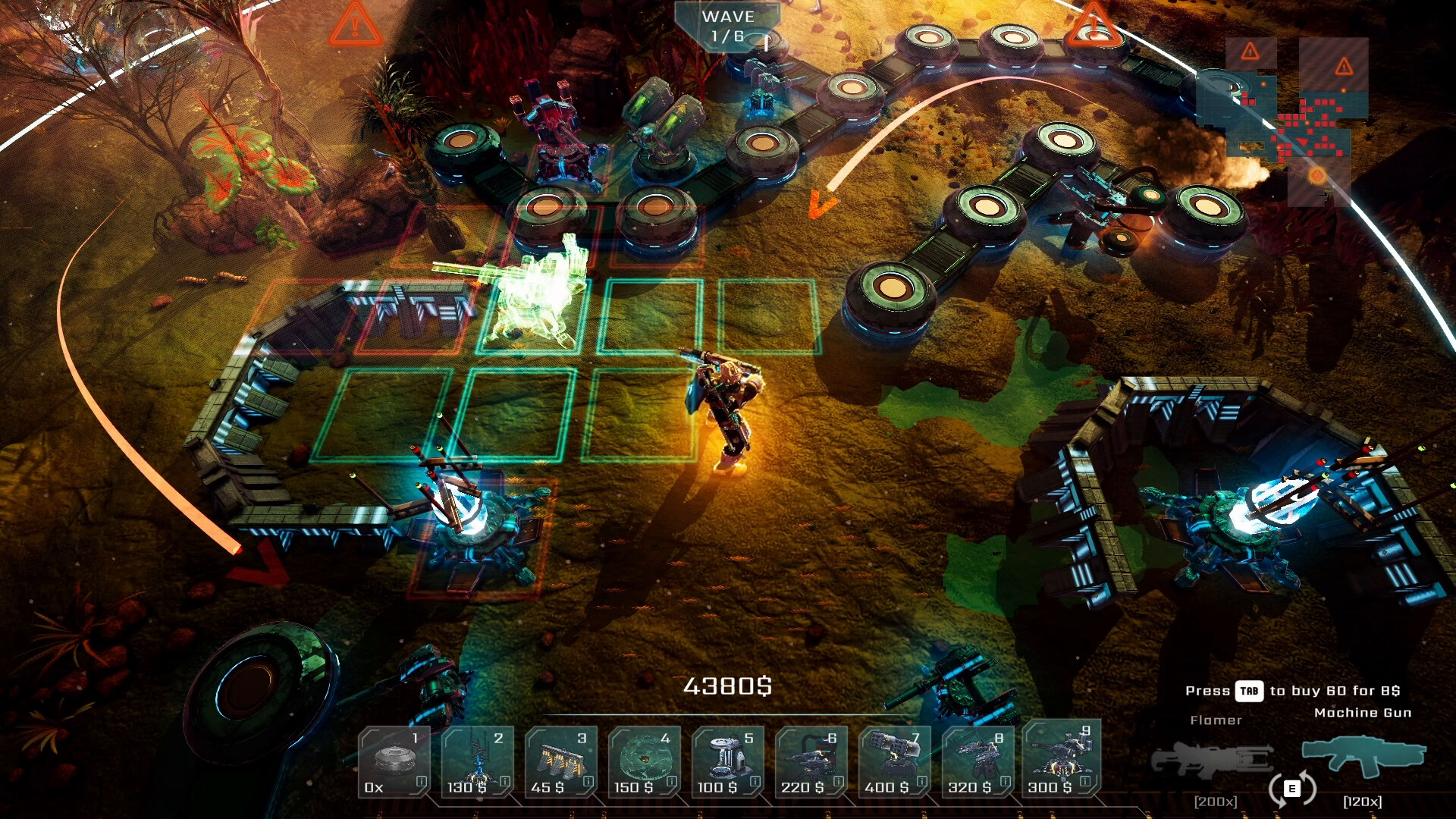 Fight waves of enemies swarming your base using 10 different weapons - each of them has two firing modes. Use them to create combo effects for maximum damage. Keep shooting as your second weapon is reloading in the meantime - NON STOP ACTION!