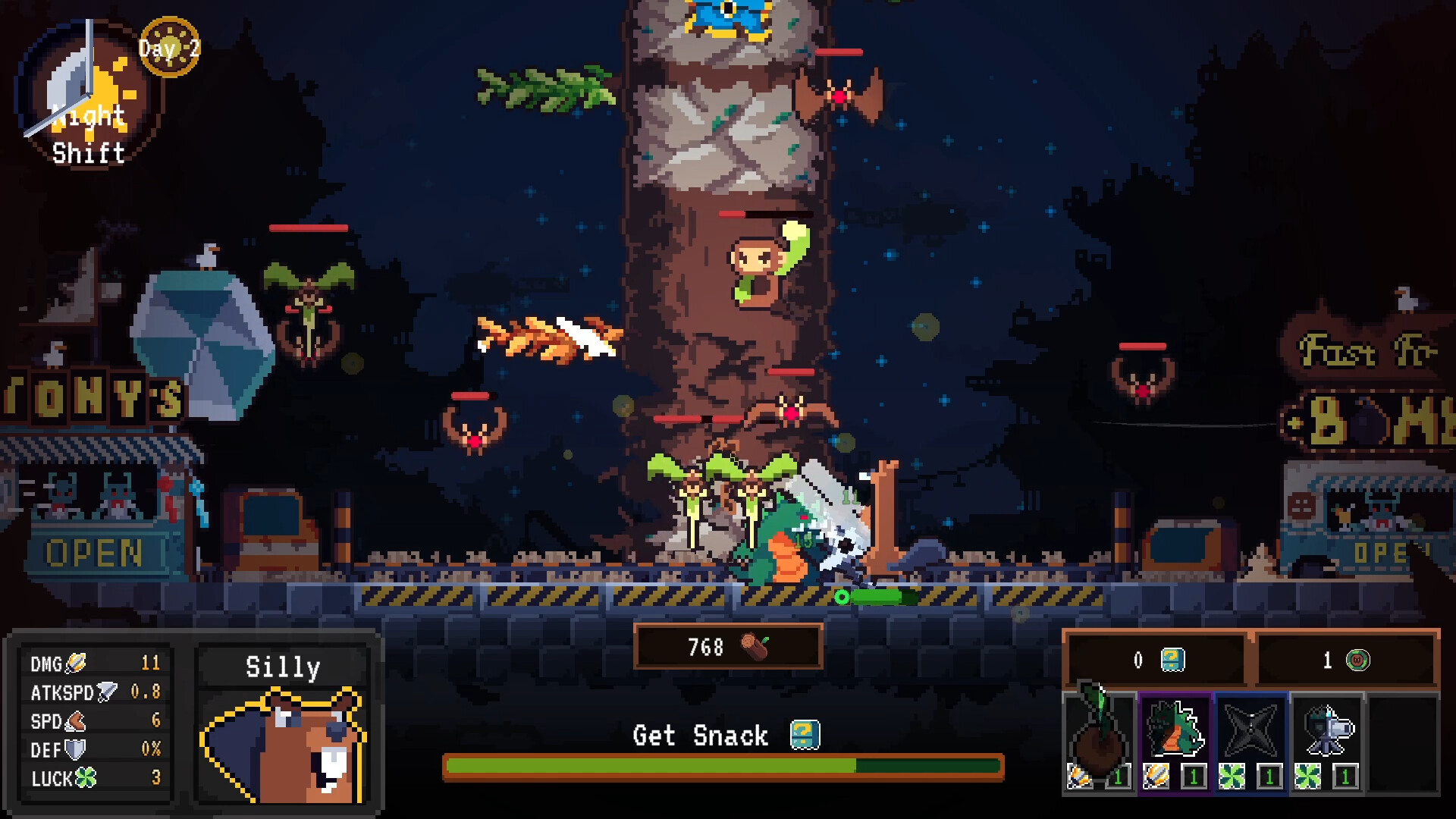 Start your shift and chip down the Tree. Once your shift is over, buy tools that help you cut it faster. Be careful, at night even more Protectors will try to defend the Tree.