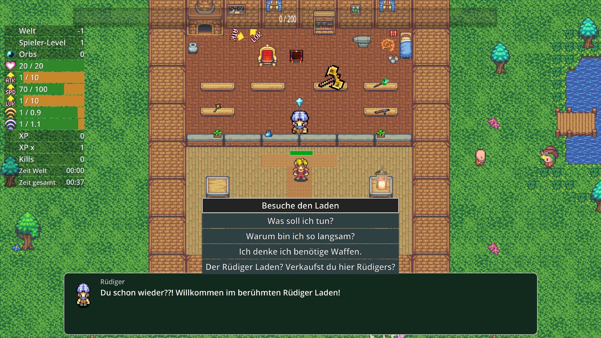 Kämpfe dich durch insgesamt 5 verschiedene Welten mit unterschiedlichen Gegnern und jeweils einem mächtigen Boss. Du stirbst dabei? Kein Problem! Ein Riss im Raum-Zeit-Kontinuum bringt dich immer wieder zurück zu Rüdiger - er kann dich in seinem Shop mit Upgrades und neuen Waffen versorgen die du nach deinem Tod behältst. Jeder gescheiterte Versuch macht dich stärker!