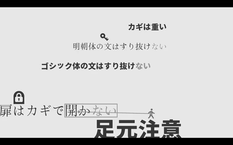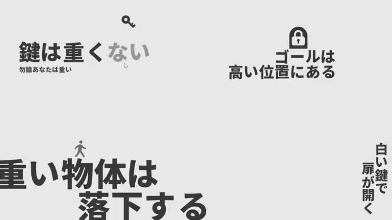 A world constructed with sentences. 2D action puzzle game where you get keys, open doors and clear stages by rewriting sentences and altering rules by adding and subtracting the word ‘Nai(no/non/not)’.