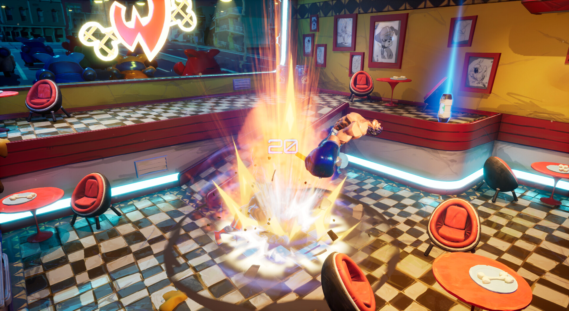 • Bird’s Eye View - Each arena is a character itself.  Use the environment to your advantage. Hurl tables and chairs.  Knock your opponents into flaming stove tops and electrical signs for high damage.