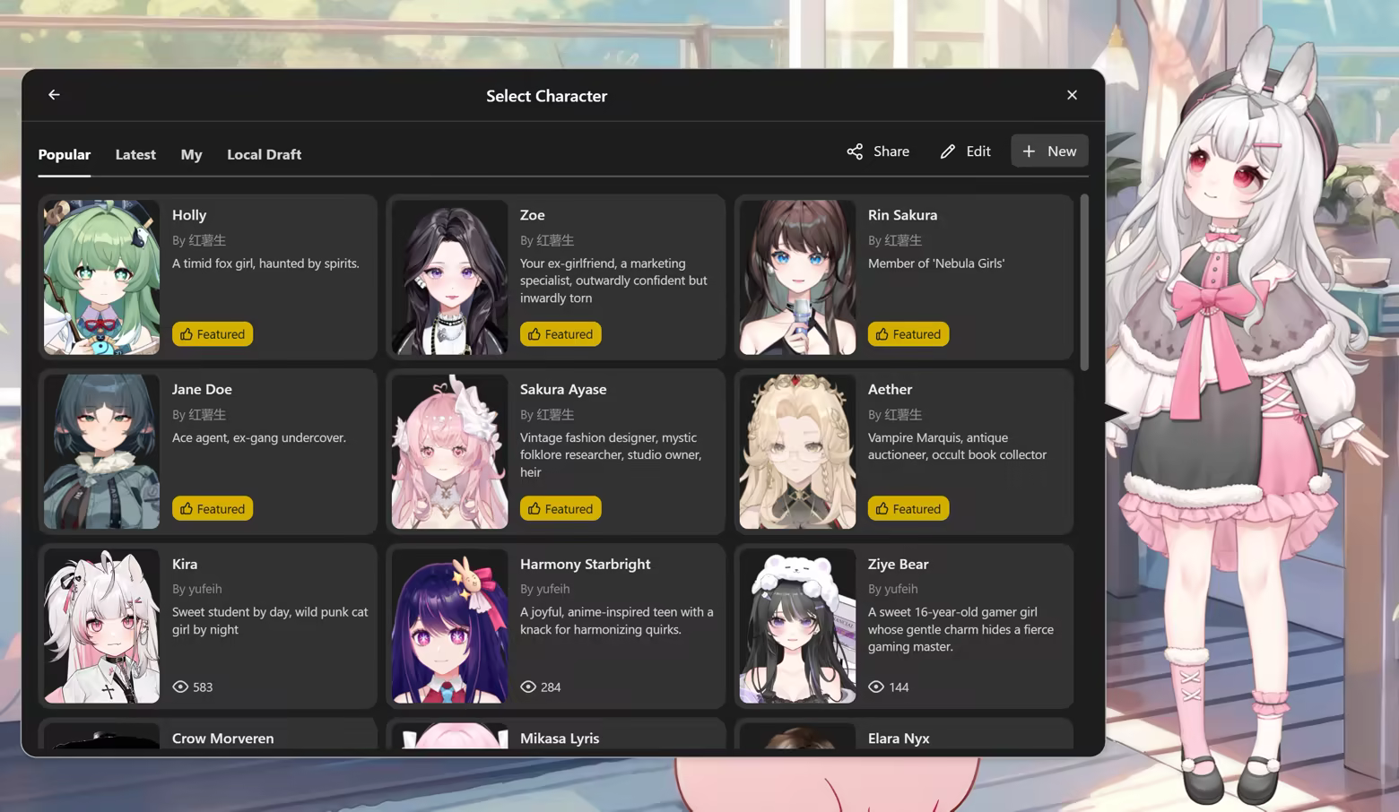 Want a desktop buddy that’s truly one of a kind? The door to creative customization is always wide open! From dialogue style to voice tone, from personality settings to story prompts—you control every detail. You can use tons of available models, or drag your own Live2D/3D OC straight onto your desktop.