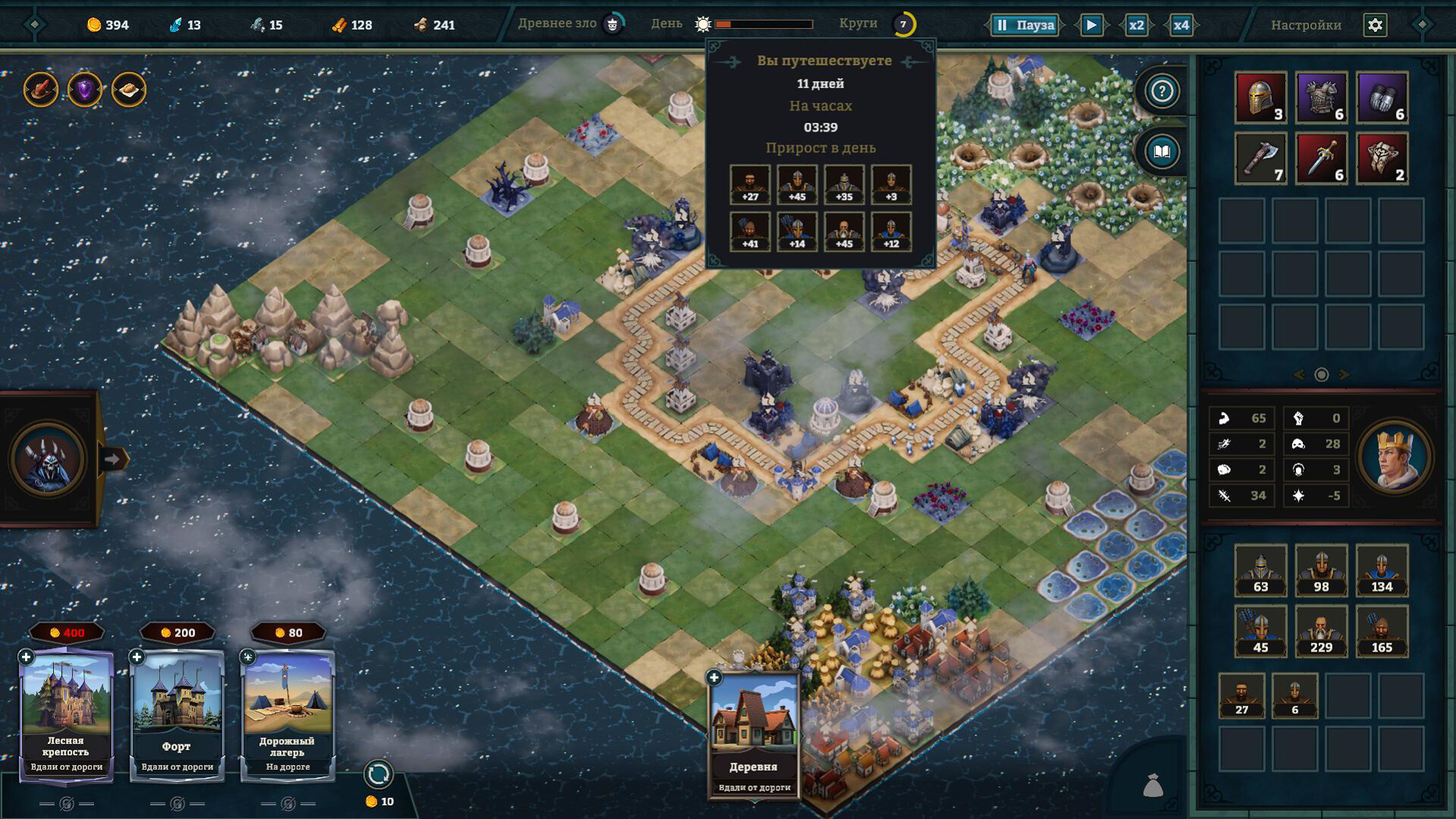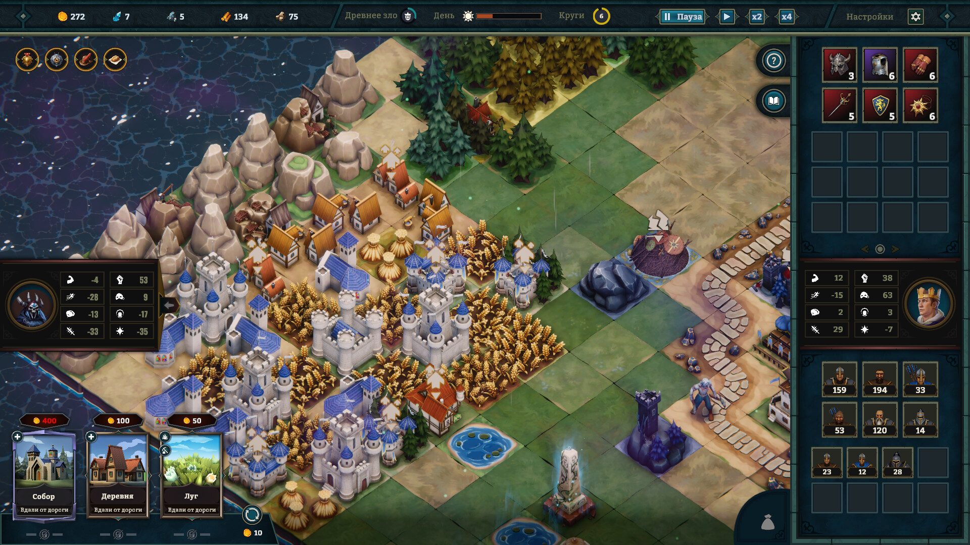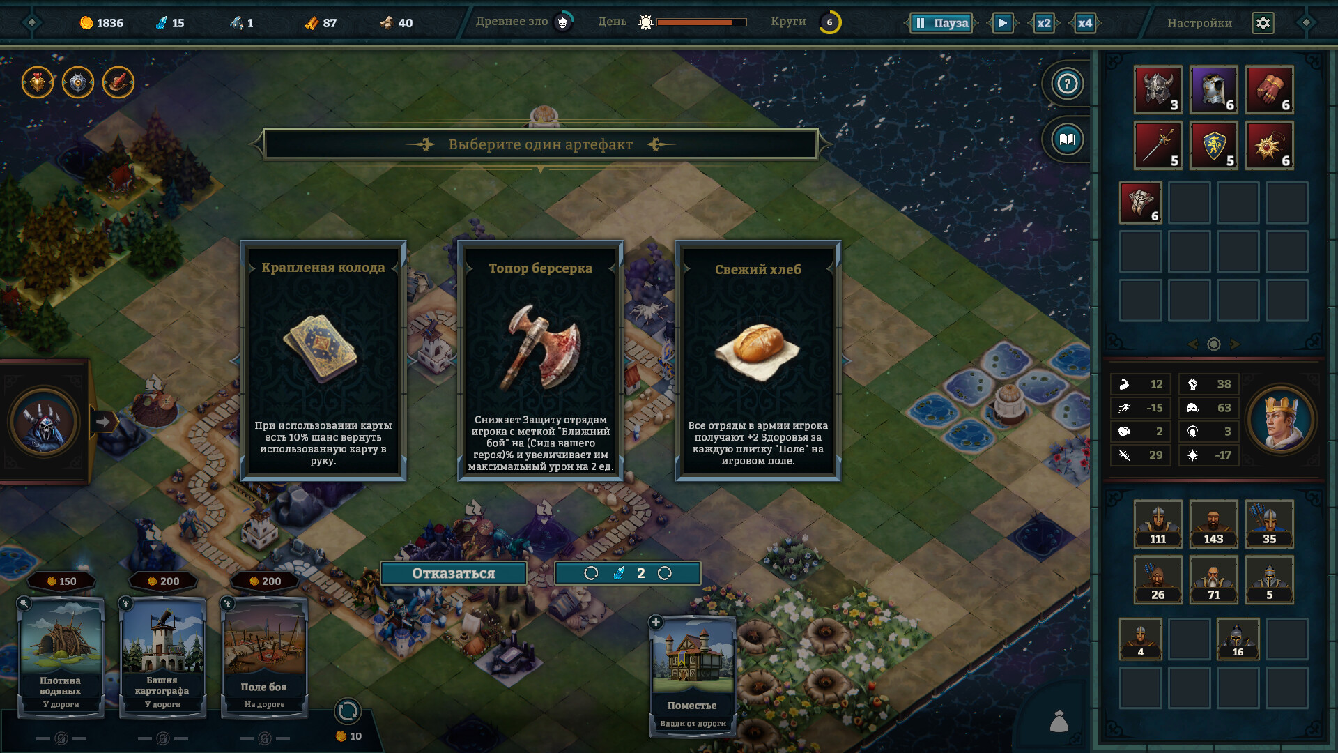 Каждый ход тебе будет доступен набор новых карт. Продумывай размещение строений на карте. Разнообразная комбинаторика позволяет развивать возможности героя.