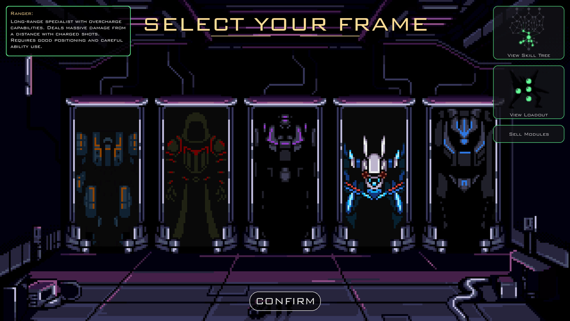 ARPG item-based progression is deeply integrated into the game's design. Modules are dropped from boss farming or long-survival runs, and then deterministically crafted for a satisfying meta progression experience.