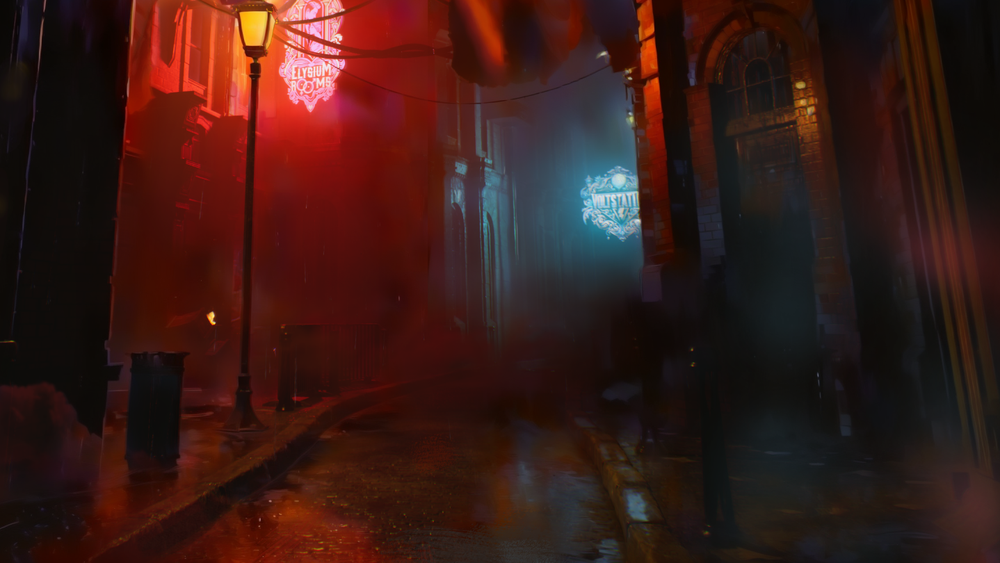'Welcome to Brightville' blends industrial Victorian architecture, neo-baroque extravagance, and futuristic cyberpunk elements. Dark fantasy themes permeate the environment, creating a "mana-punk" world where magic fuels machines and the city's fate teeters on the edge of destruction.