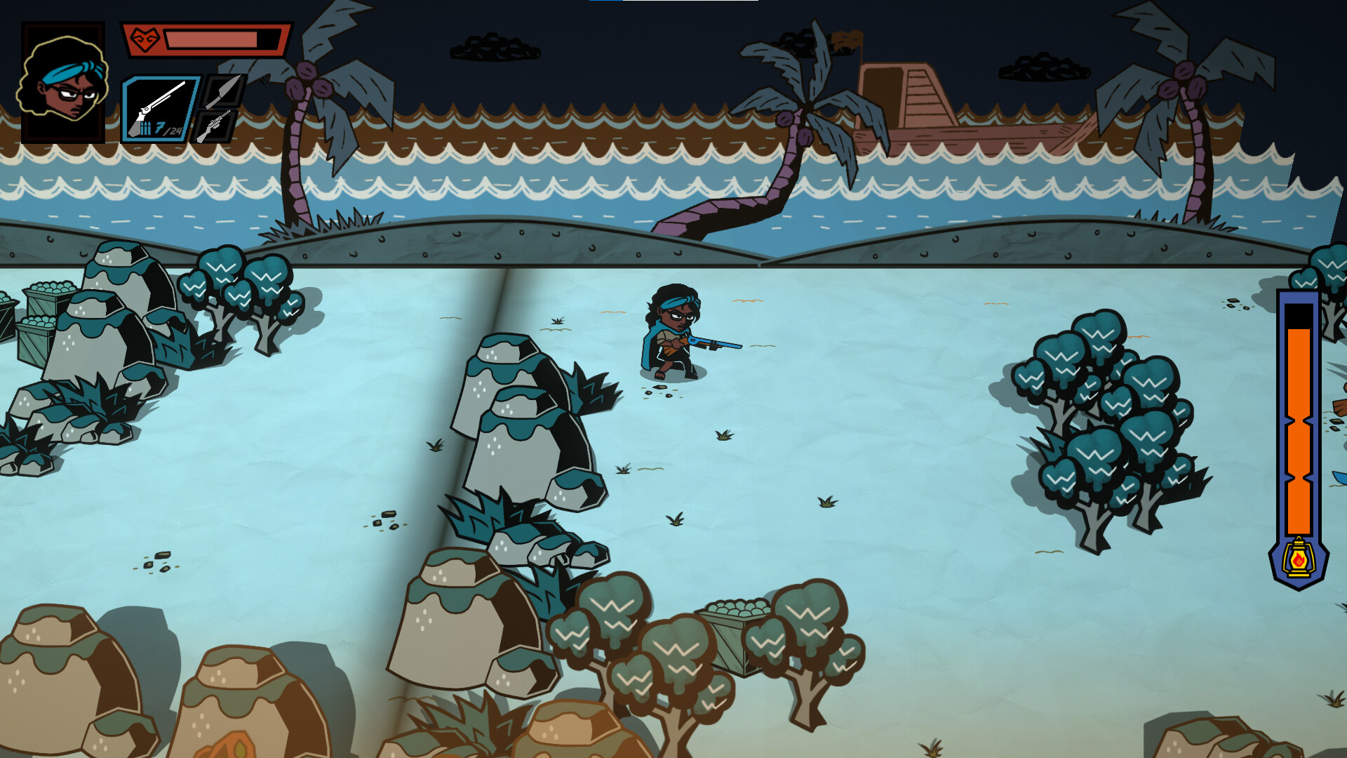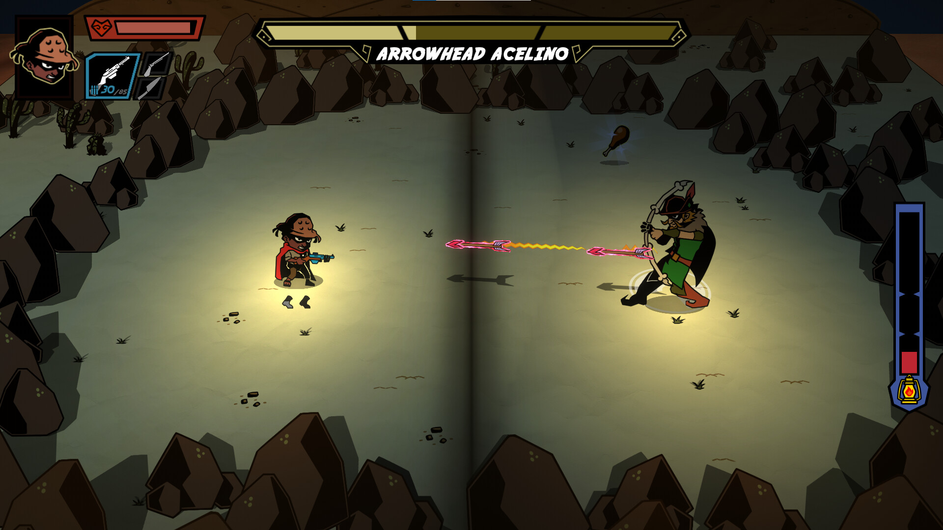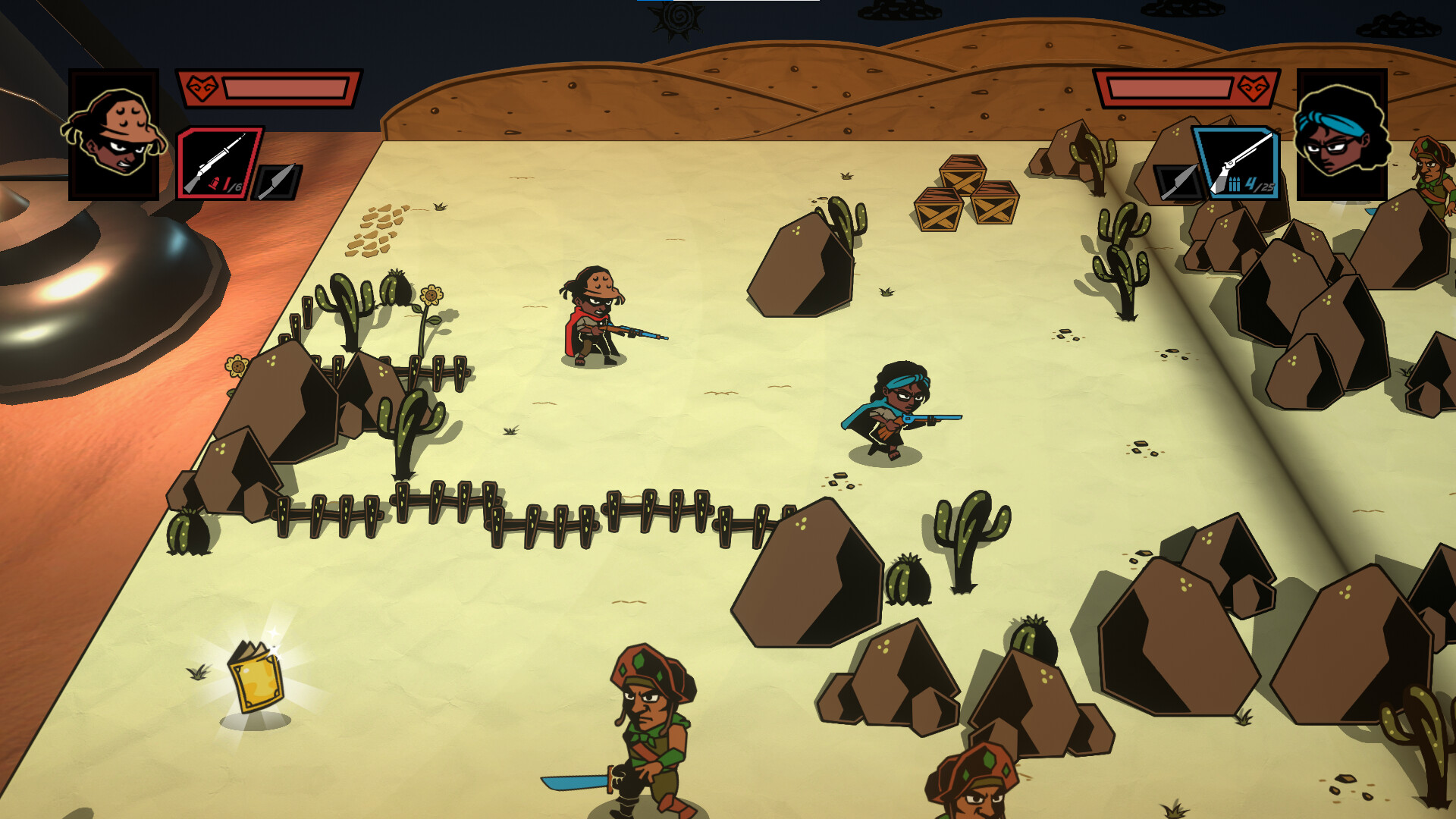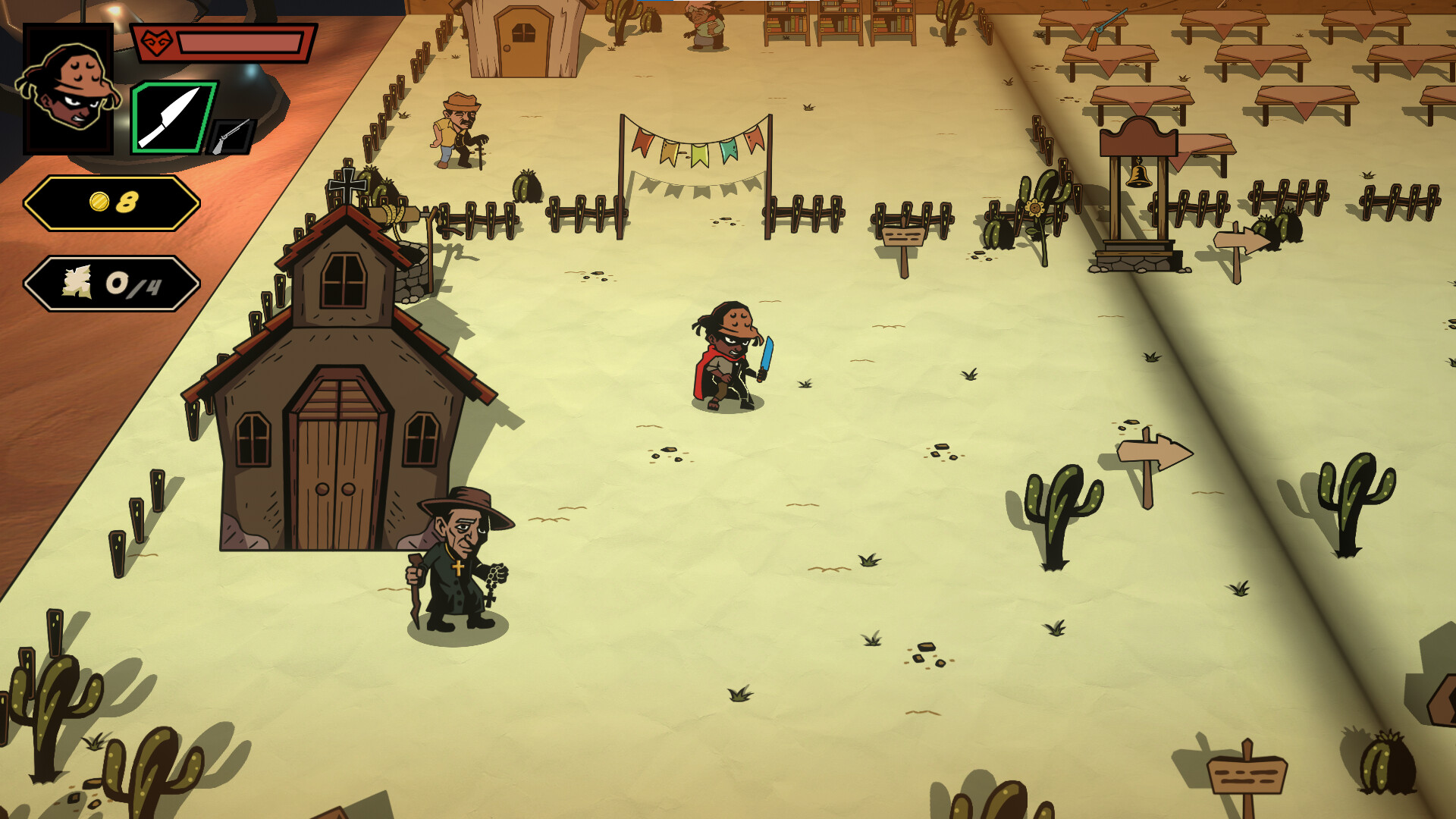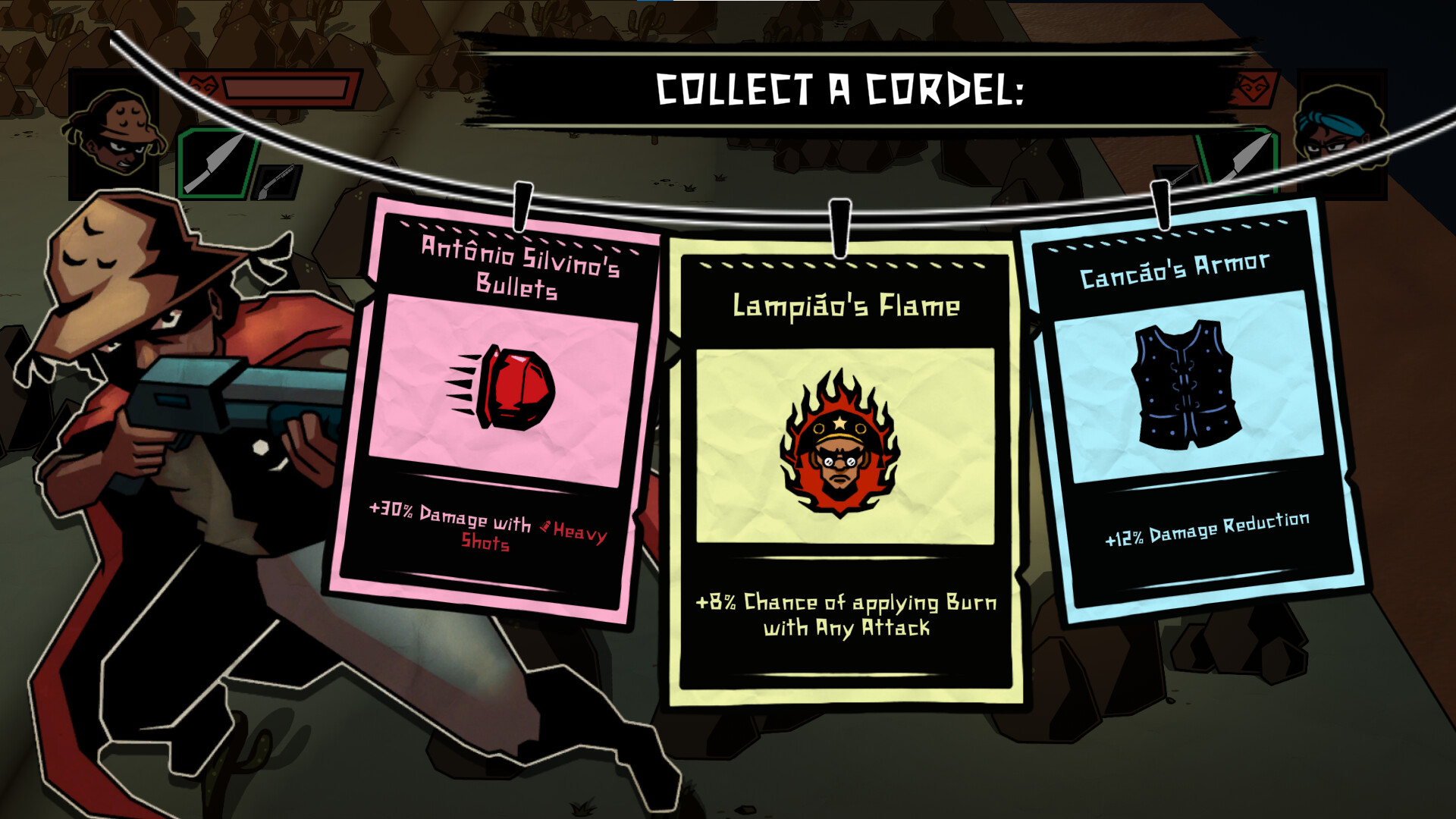 • Stylized 2D visuals inspired by woodcut art and cordel literature