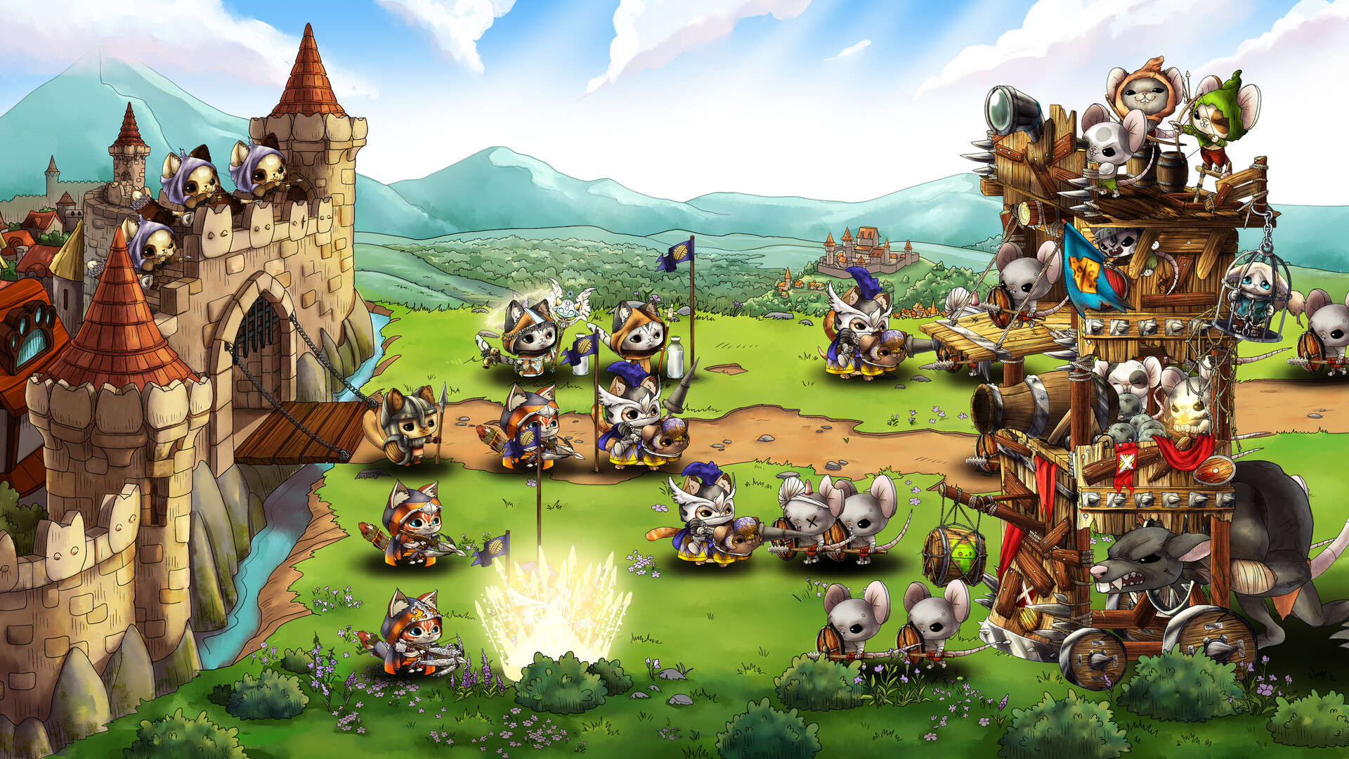 Epic character focused tower defense with upgradable cats fighting monstrous, giant mice.