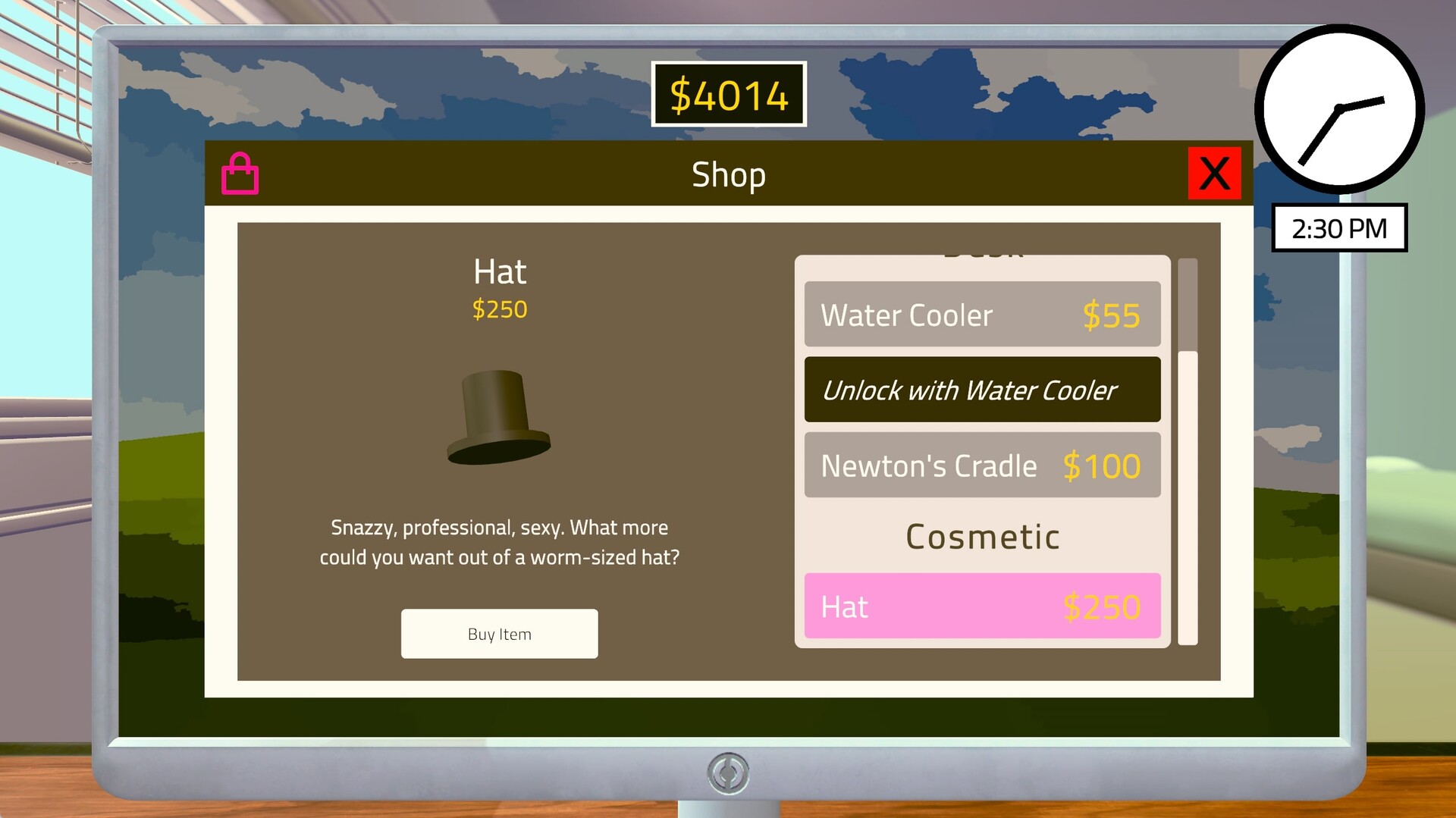 Get swole in your home gym and read esoteric finance books to unlock new perks and ascend to the next level of pretending to know what you're doing. Buy new upgrades in the shop to make your mind-numbing job a bit easier as a 3-inch long invertebrate. And if you can step up and really start contributing, you may finally escape the prison of junior-level finance employment.