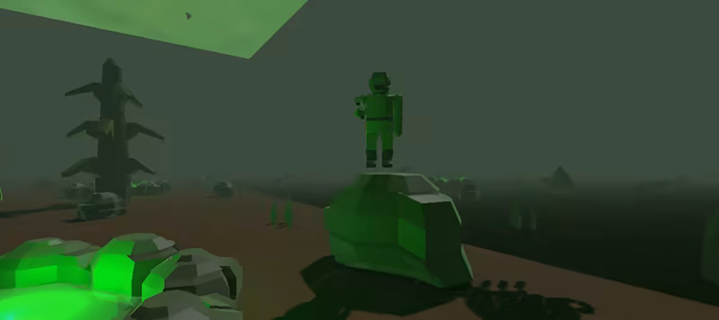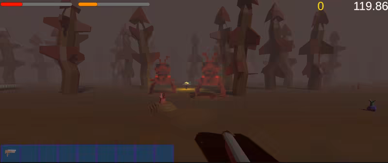 Survival of the fittest, from hunted to hunter. Start the game defenseless and only capable of picking some crops. Later acquire weapons and turn the tables on those terrible creatures.
