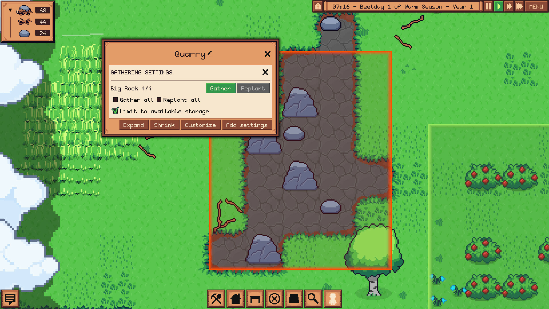 A friendly fantasy colony sim where you manage halflings. Start with nothing, launch expeditions into the wilds, experiment with crafting to discover new items, and evolve your settlement into a thriving, self-sufficient town! Inspired by the genre of RimWorld and the ambience of Stardew Valley.